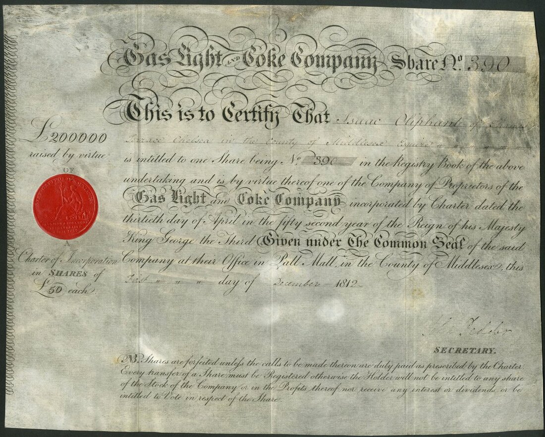 Great Britain: Gas Light and Coke Company, £50 share, 181[2], #390, black printing, on vellum, red seal at left, signed by the secretary. Formed by Royal Charter in 1812, the first gas works in the United Kingdom and the first public gas works in the world. Works were established at the Royal Mint in 1817. Acquired many smaller gas companies. Nationalised in 1948 and became the major part of North Thames Gas Board. GVF and scarce.