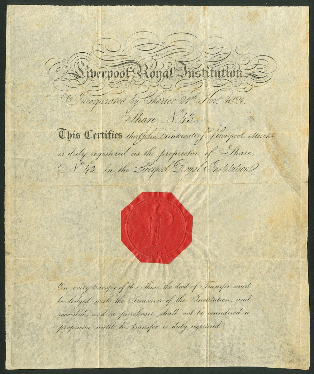 Great Britain: Liverpool Royal Institution, share number 43, 1821, black printing, on vellum, red paper seal attached lower centre. VF and rare.