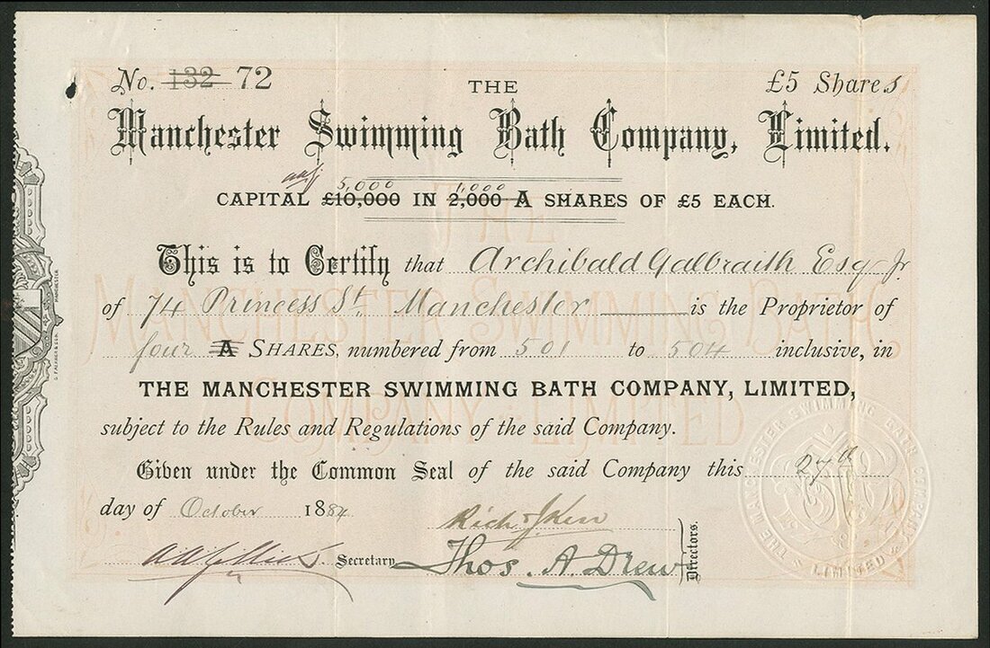 Great Britain: Manchester Swimming Bath Company Limited, £5 shares, 18[84], #72 (overprinted on #132, arms at left, black, pink underprint. Formed in 1878 to acquire land at South Parade, off Deansgate to build a swimming pool and turkish baths, but also with a billiards and a smoking and news room. VF and rare.