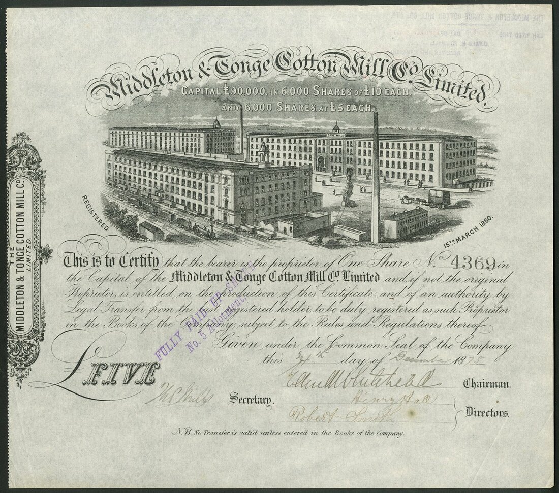 Great Britain: Middleton & Tonge Cotton Mill Co. Ltd., £5 share, 18[79], #4369, lovely large vignette of Dane Mills with a variety of transport, black. Incorporated in March 1860 to erect a cotton mill on land acquired at Tonge, near Middleton, Lancashire. By 1871 3 mills had been built as is shown in this large vignette. After some years in liquidation and attemps at reconstruction the receiver gave instructions for the machinery to be sold at auction in 1914. The huge site at the time contained over 120,000 spindles. VF.