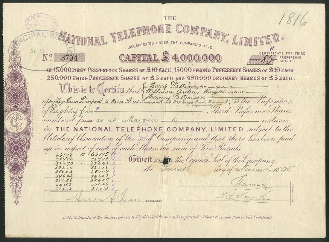 Great Britain: National Telephone Company Limited, third preference shares, 18[95], #3794, capital £4,000,000, signed by Lord Harris as director, scrollwork at left, pale mauve. Founded in 1881 and gradually acquired several smaller companies until it was taken over by the Post Office in 1911. Lord Harris (1851-1932) was a Colonial administrator, politician and amateur cricketer. Under Secretary of State for India, Governor of Bombay and later Lord in Waiting to Queen Victoria. Best known for his cricketing career, captaining the England team on several ocasions. President of the MCC and influential in regulating test cricket. Small hole at folds, F-VF and rare.