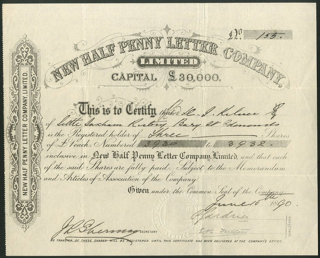 Great Britain: New Half Penny Letter Company Limited, £1 shares, 18[90], #155, seal depicts prepaid postal stationery envelope, black. The company was a reorganisation of the Half Penny Letter Post Company which was formed to sell advertising to place on envelopes and paper with prepaid ½d embossed stamps. VF and rare. Not seen at auction before.