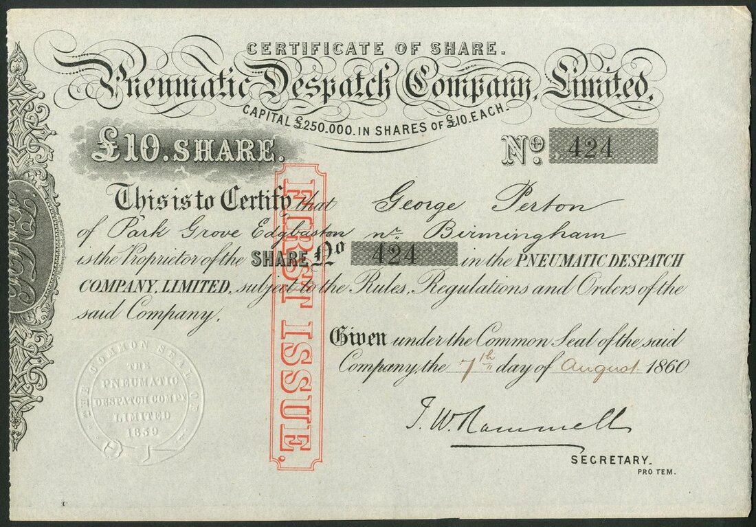 Great Britain: Pneumatic Despatch Company Ltd., £10 share, 1860, #424, attractive black printing, red overprint