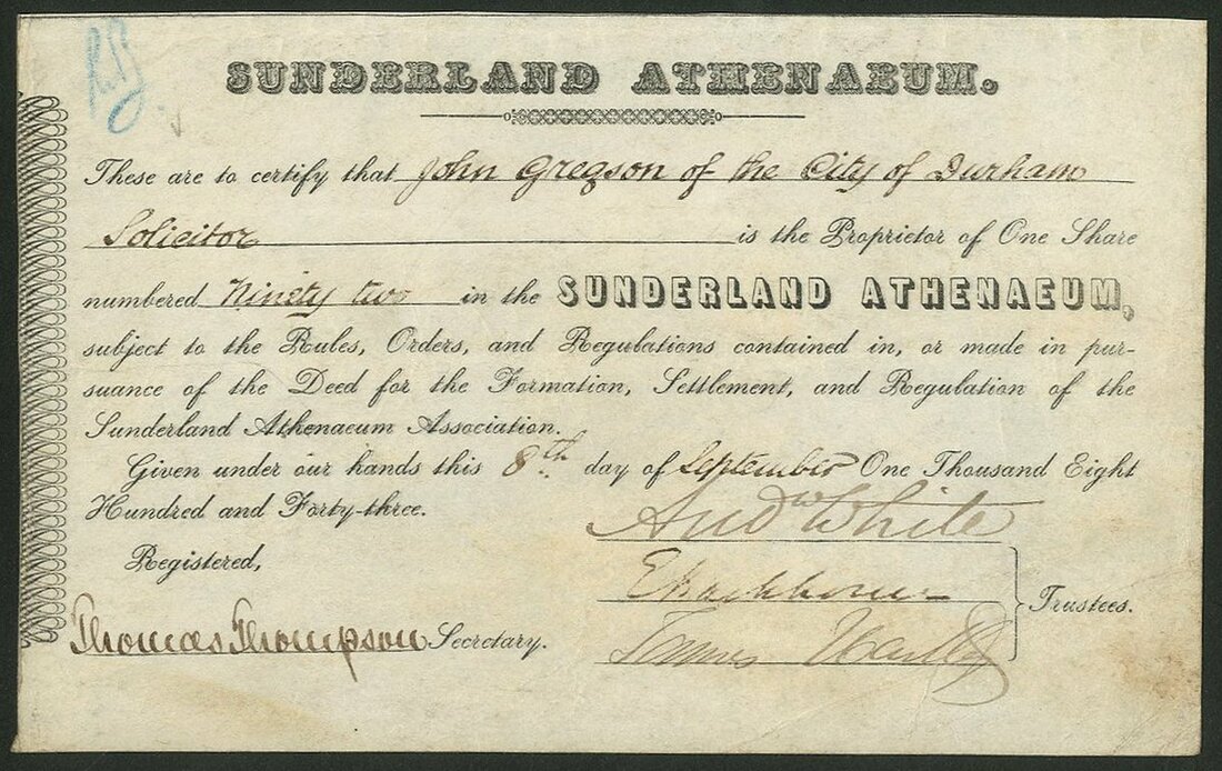 Great Britain: Sunderland Athenaeum, certificate for one share, 1843, #92, small format piece on vellum, black printing. Opened by the Literary and Philosphical Society and housed a museum of pieces from the city's first library. VF.