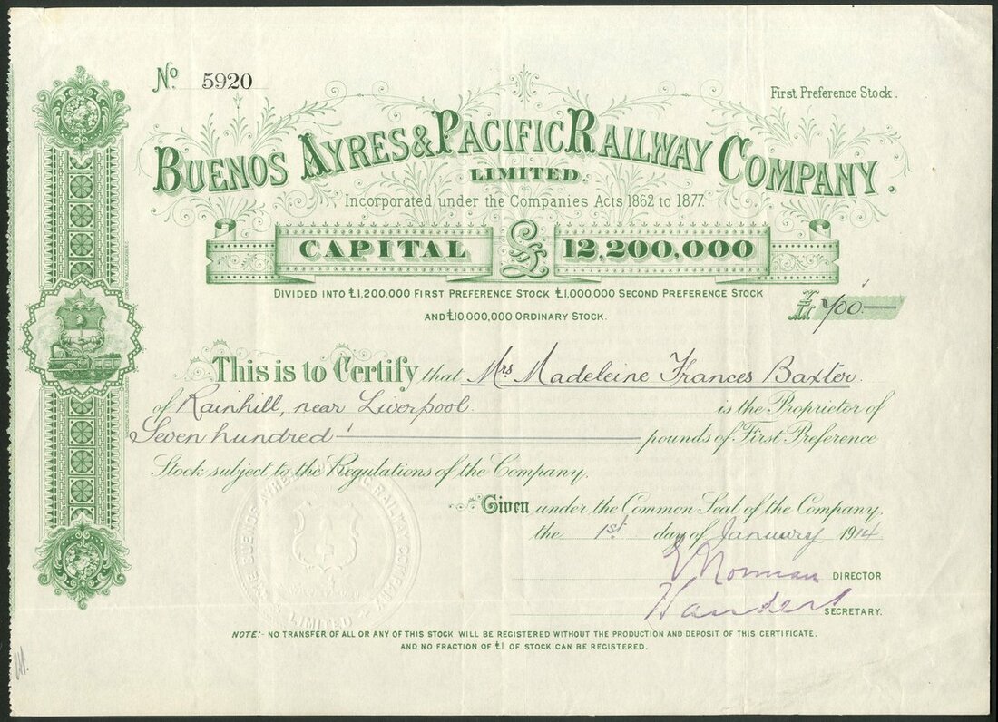 Argentina: Buenos Ayres & Pacific Railway Company Ltd., First Preference stock certificate for £[700], 19[14], #5920, scrollwork at left with arms in centre, green, printed by Waterlow & Sons. GVF and rare, despite the high serial number.