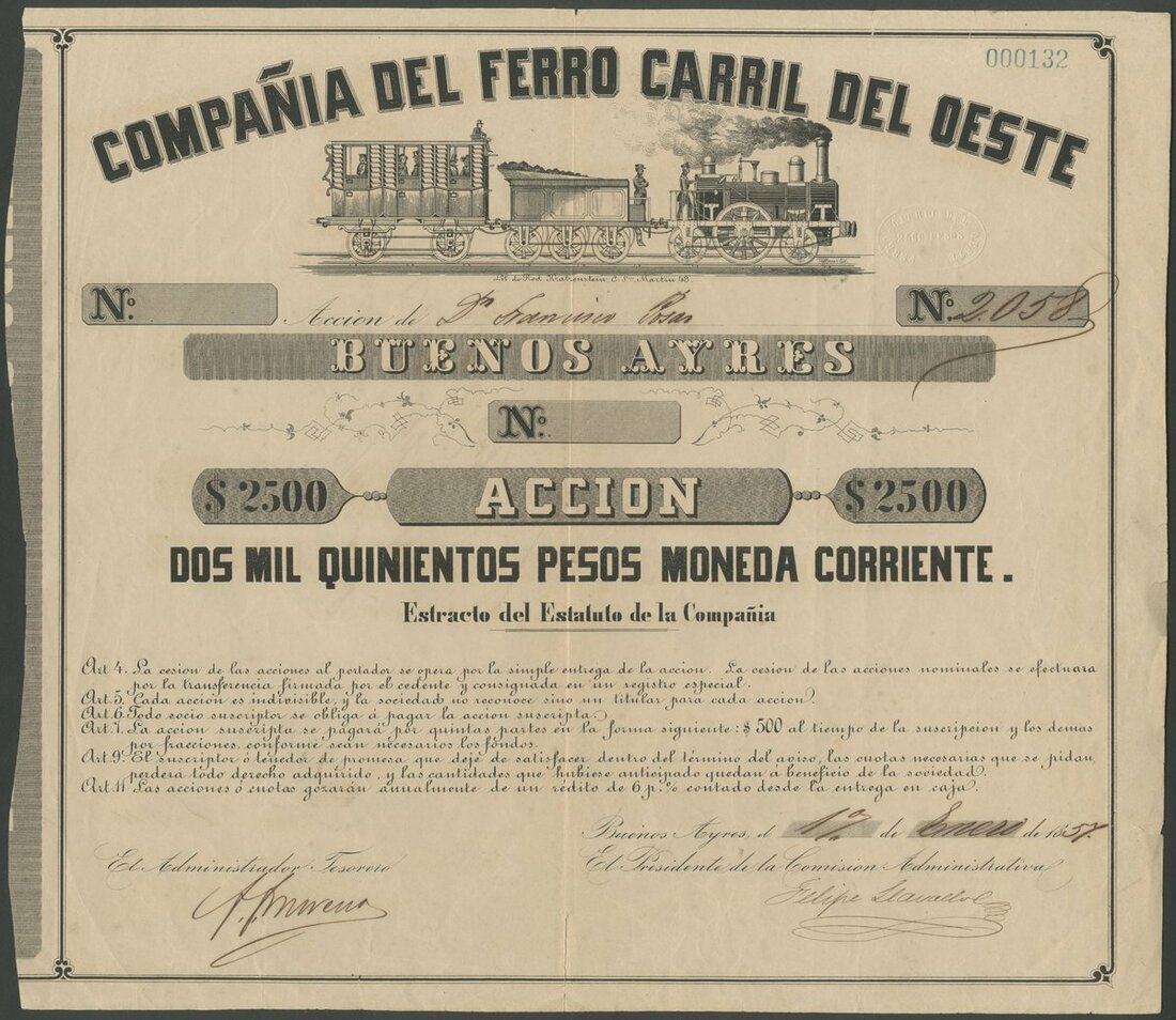 Argentina: Compañia del Ferro Carril del Oeste, Buenos Ayres, 2500 peso share, Buenos Ayres 18[57], #2058, lovely vignette of early steam train with driver on open platform, coal tender and stoker and a single carriage full of passengers, black. The first railway to be built in Argentina, incorporated in 1857. It was heavily financed by the province of Buenos Aires which was at that time an independent state, the province becoming sole owner of the line in 1863. However due to the State's debts later in the century, it was sold to British company The Buenos Aires Western Railway Ltd. In 1890. Couple of small edge tears, VF and scarce.