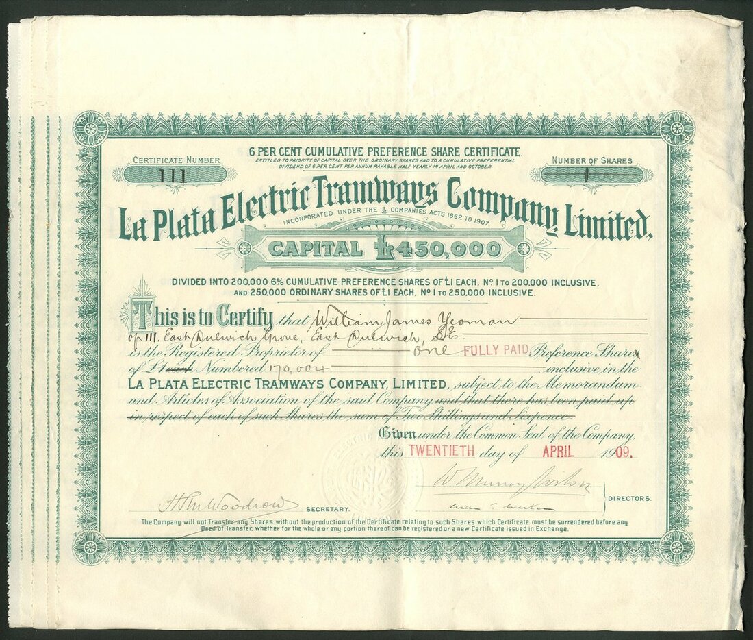 Argentina: La Plata Electric Tramways Company Limited, 6% cumulative preference shares of £1, a series of certificates 19[09], #111,112,113,114 and 116, ornate borders, green. Together with 2 miscellaneous certificates. Generally VF and better (7).