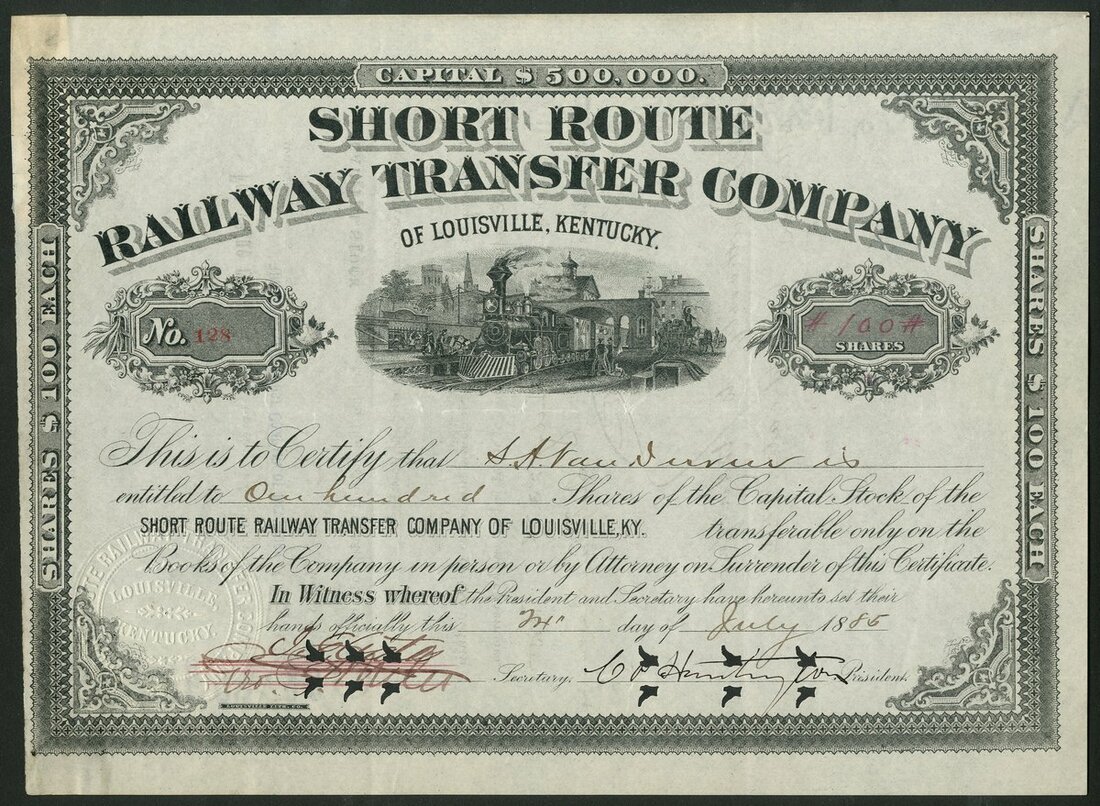 U.S.A.: Short Route Railway Transfer Company of Louisville, Kentucky, $100 shares capital stock, 18(85), #128, signed by Collis P Huntington as President, vignette of steam train, black. Collis P. Huntington (1821-1900), railroad magnate and capitallist . One of the 'Big Four' along with Stanford, Crocker and Hopkins. Hole cancelled, VF.