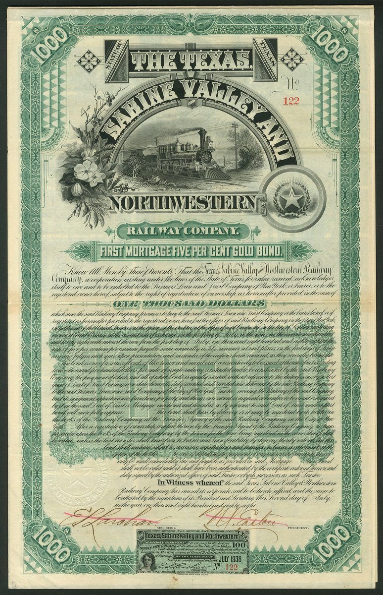 U.S.A.: Texas, Sabine Valley and Northwestern Railway Company. First Mortgage 5% Gold Bond, 1888, $1000, #122, steam train at top, green and black, with coupons, ink cancelled through signatures. GVF.