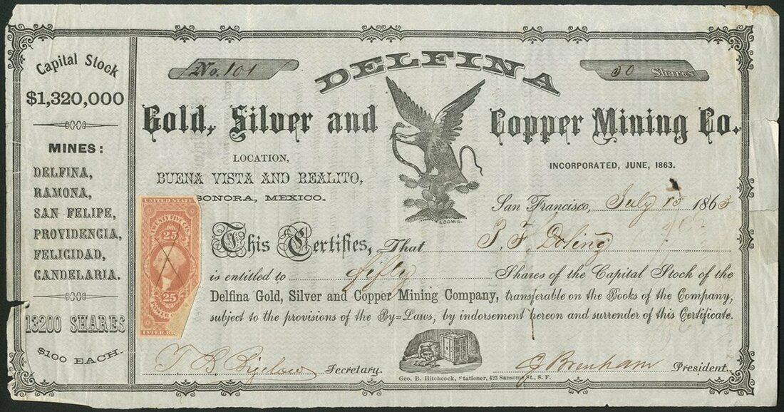 U.S.A.: Delfina Gold, Silver and Copper Mining Co., $100 shares, San Francisco 186[3], #101, eagle in centre, black, pink underprint, adhesive revenue stamp. Mines in the Buena Vista and Realito Districts, Sonora, Mexico. A few small edge tears, VF.
