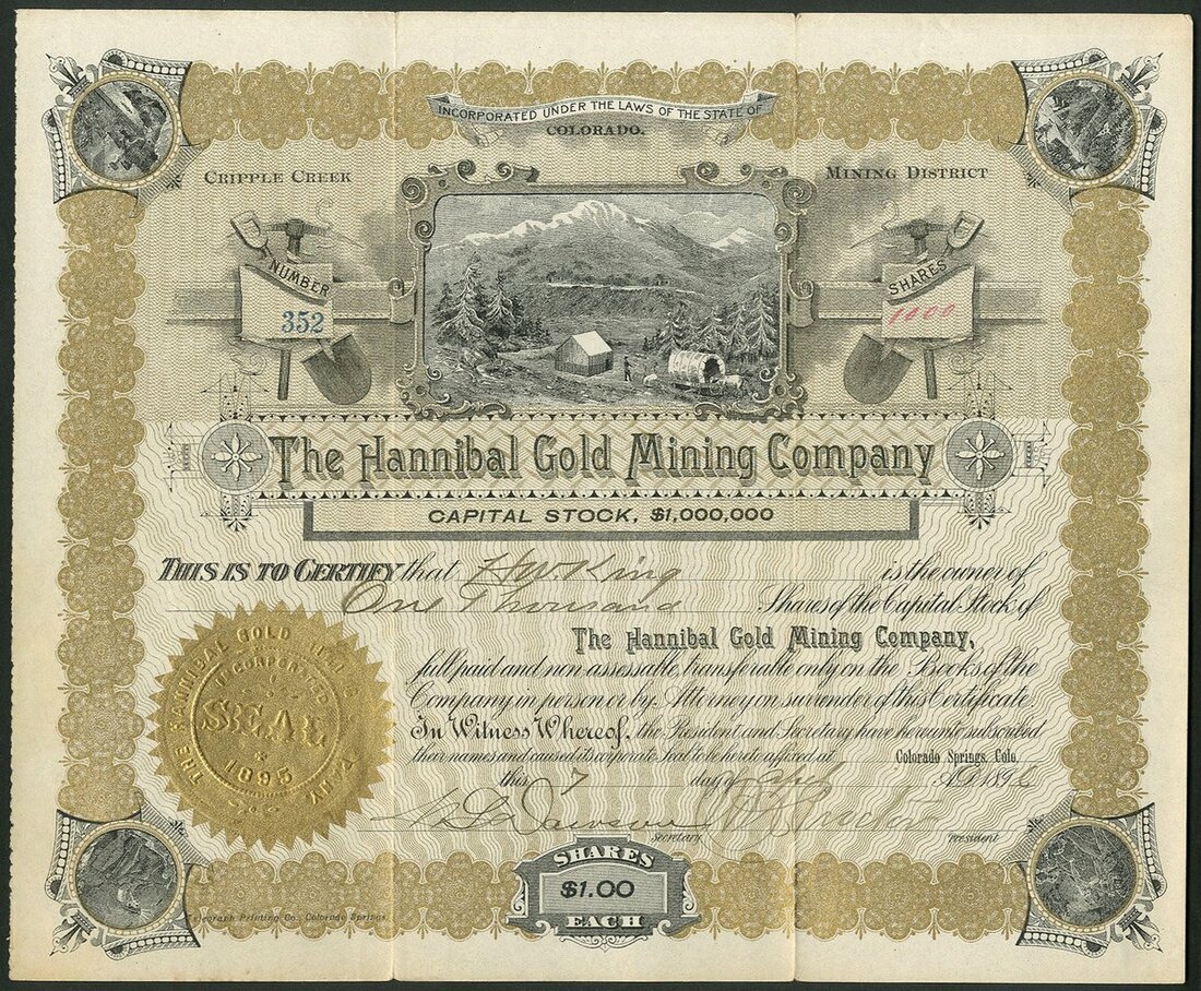 U.S.A: Hannibal Gold Mining Co., Colorado, $1 shares, 189[6], #352, mountain top mine site above title, ornate border, black and gold. Cripple Creek Mining District. Edge tears on folds, AVF.