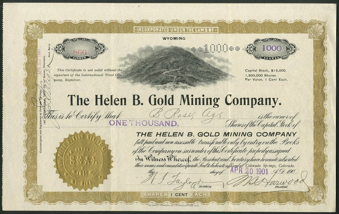U.S.A: Helen B. Gold Mining Co., Colorado, 1 cent shares, 190[1], #866, mountain top site above title, decorative border, black and gold. Owned the Helen B mine at Tenderfoot Hill near Colorado Springs. GVF.