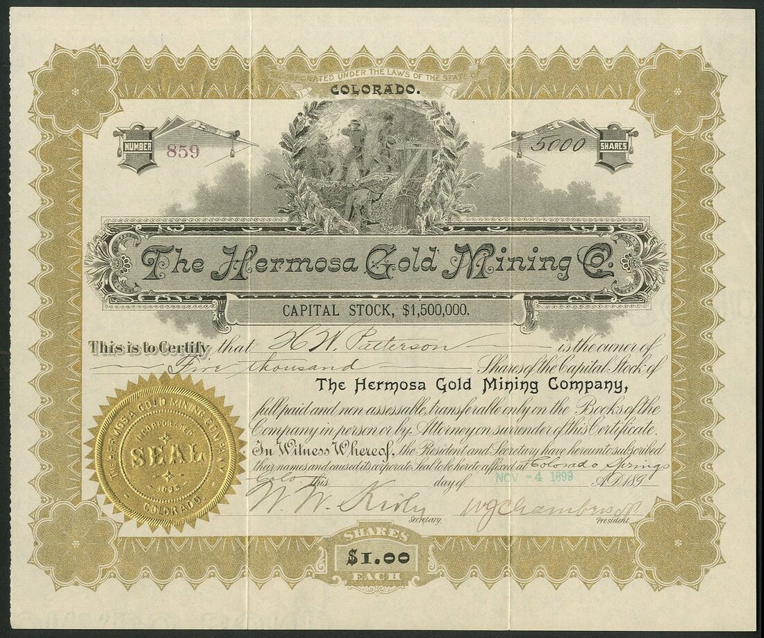 U.S.A: Hermosa Gold Mining Co., Colorado, $1 shares, 189[9], #859, miners at work above title, ornate border, gold and black. Owned the '93 on Squaw Mountain adjoining the Tom Bigbee, the Hermosa, First Chance, Lone Pine and Success, all in Cripple Creek, Colorado. GVF.