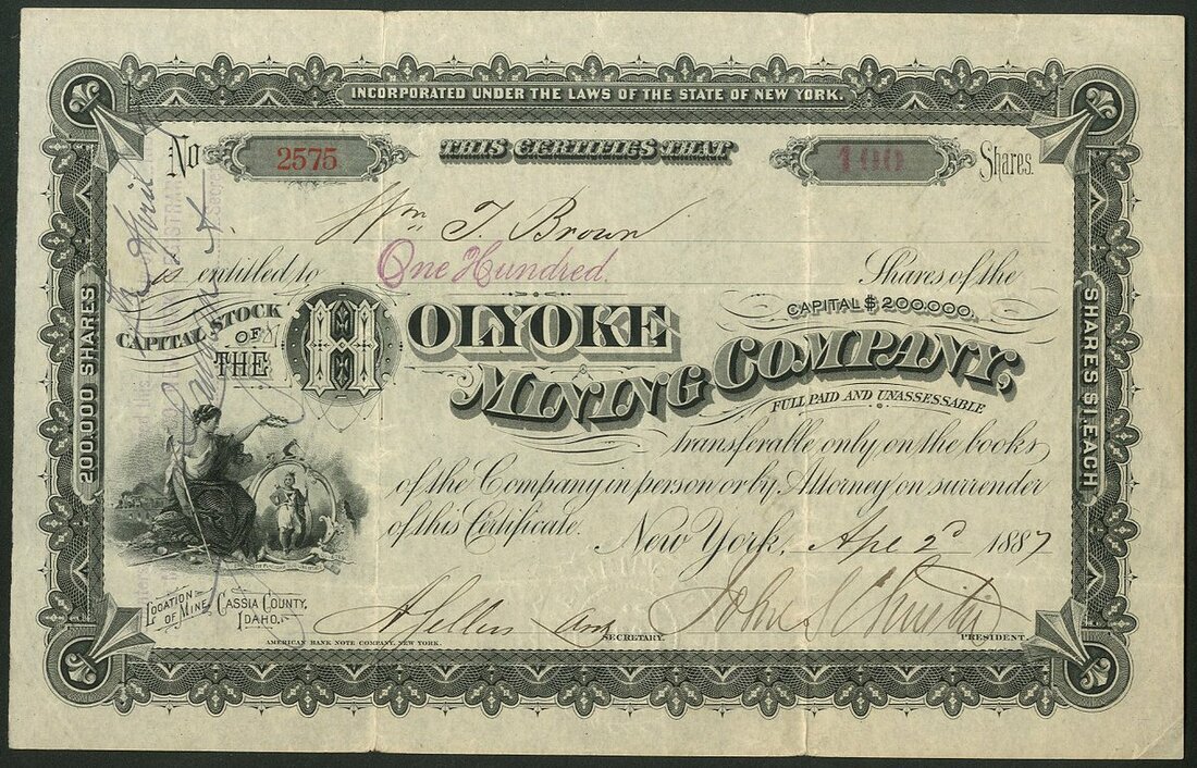 U.S.A: Holyoke Mining Co., Idaho, $1 shares, New York 188[7], #2575, small piece with decorative black printing. Mine in Cassia County, Idaho. Tri folds, GVF.