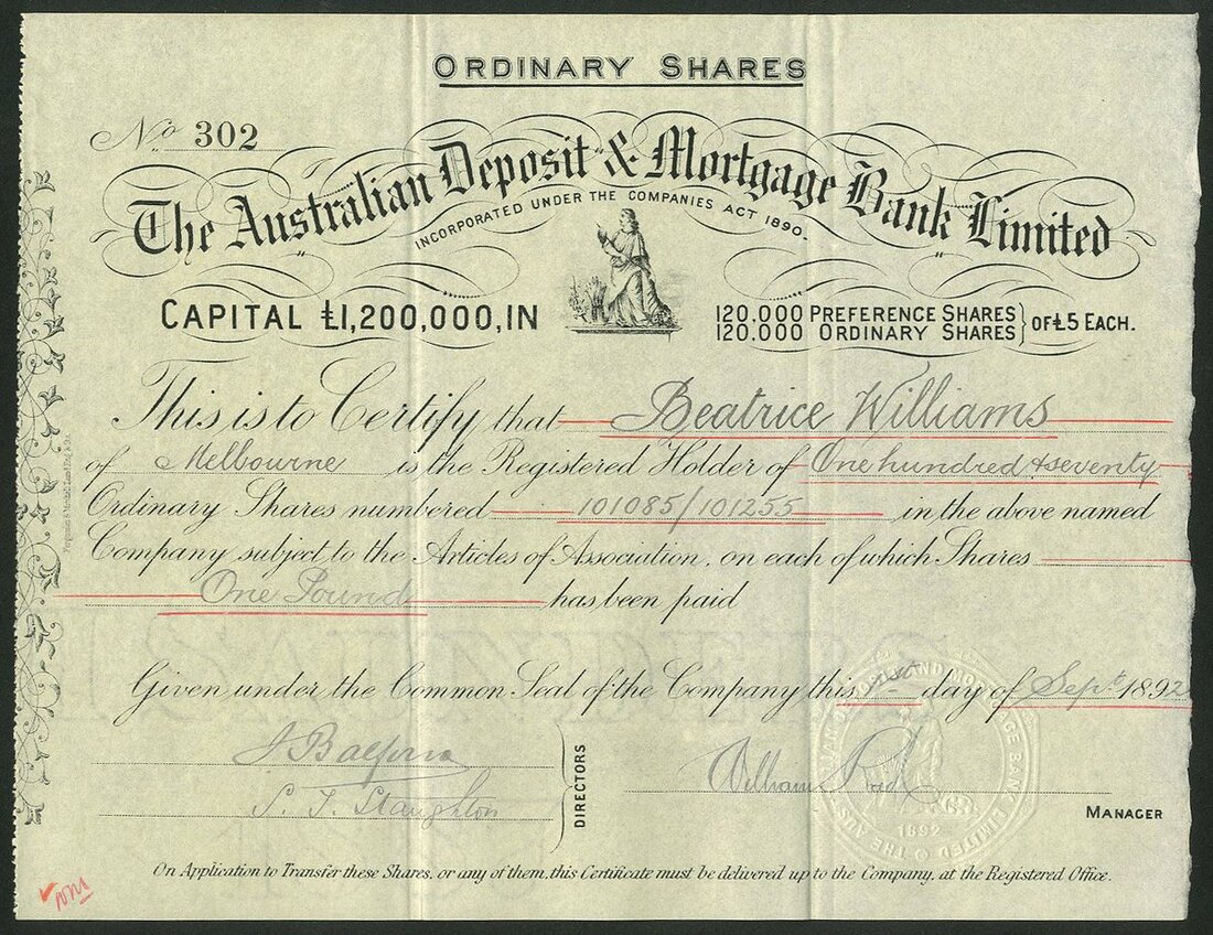Australia: Australian Deposit & Mortgage Bank Limited, £5 ordinary shares, 189[2], #302, small allegorical figure in centre, black. Registered in Victoria in 1874, as Limited in 1892. Taken over by Bank of Adelaide in 1919. GVF and rare.