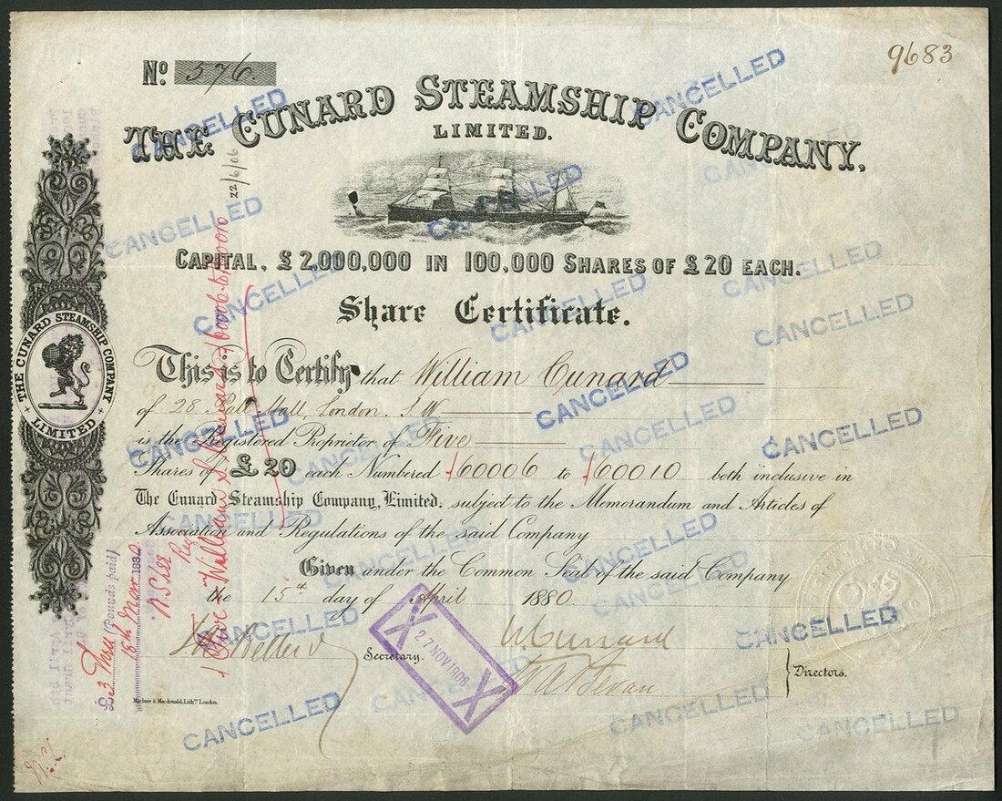 Great Britain: Cunard Steamship Company Limited, £20 shares, 188[0], #576, issued to and signed by William Cunard as director, also signed by W.A.Bevan as a director, steamship vignette top centre, black. William Cunard was second son of Sir Samuel Cunard, founder of the business. W.A.Bevan was a partner in Barclays Bank in Lombard Street. Stamped CANCELLED a few time, spike holes otherwise VF and rare. Fisrt time seen at auction.