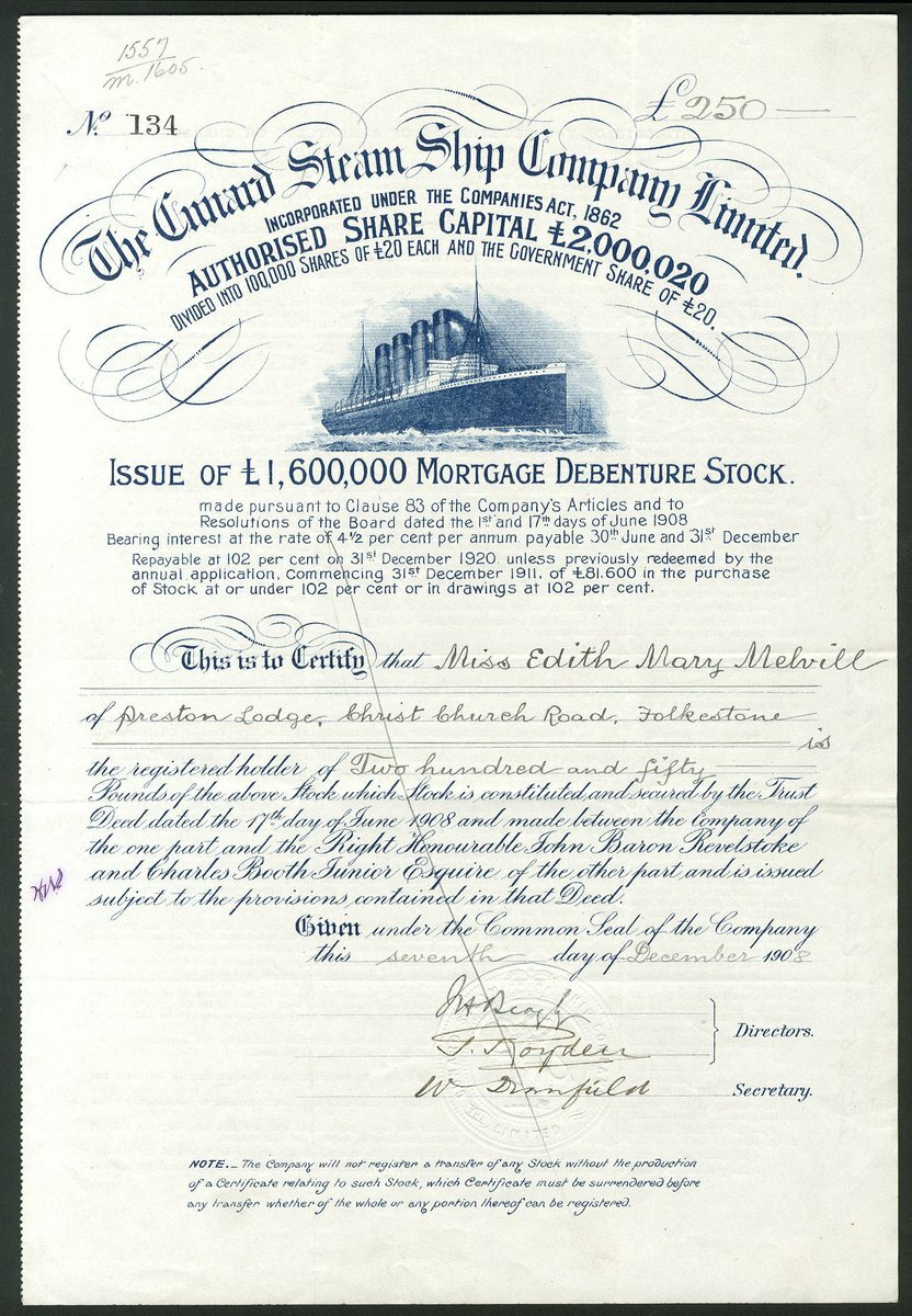 Great Britain: Cunard Steam Ship Company Ltd., 4½% Mortgage Debenture stock, certificate for [£250], 190[8], #134, attractive 4 funnel steamer at top, possibly the Lusitania, blue, embossed seal at bottom. Founded in 1838 and has absorbed numerous companies during the last 150 years, including White Star. GVF.