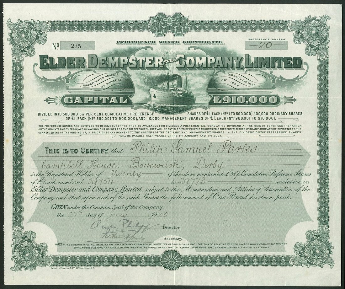 Great Britain: Elder Dempster and Company Ltd., £1 preference shares, 19[10], #275, signed by Owen Phillips (later Lord Kylsant) as Director, steamship in centre, green. Owen Phillips - Chairman of the Royal Mail Steam Packet Company from 1903. Started a rapid expansion programme acquiring among others White Star Line in 1927, which eventually led to his downfall and the very high profile prosecution in 1931 for issuing false balance sheets. GVF.