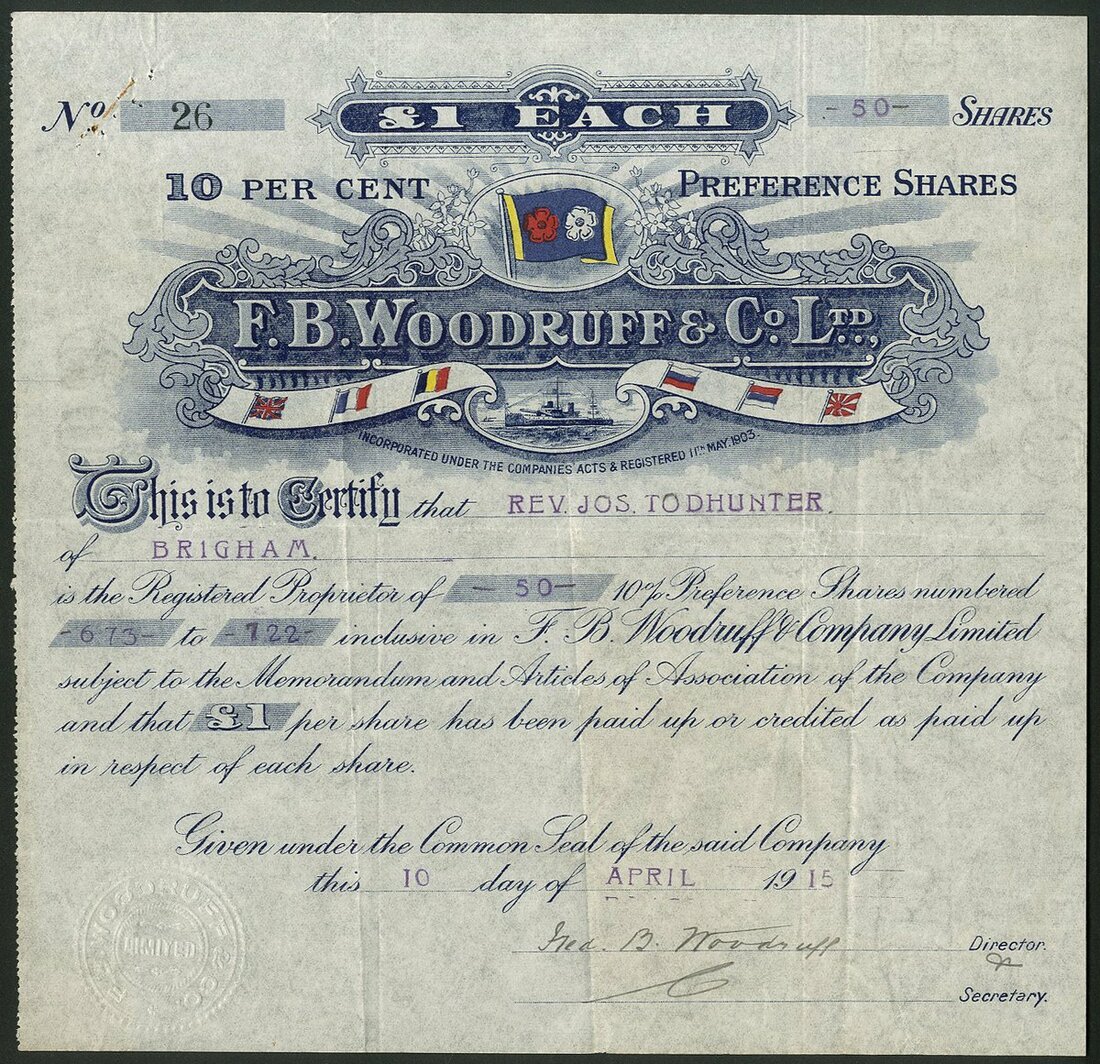 Great Britain: F. B. Woodruff & Co. Ltd., 10% preference shares for £1 each, 19[15], #26, very attractive piece with ship below title, flags at either side, blue with red and yellow details. Based in Cardiff. Pinholes top left, VF. First time seen.