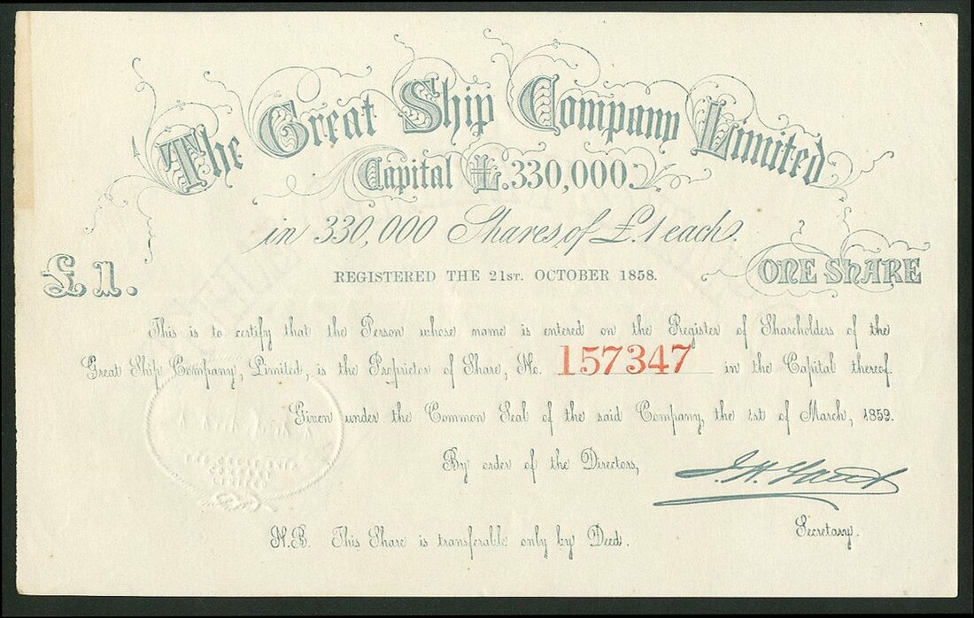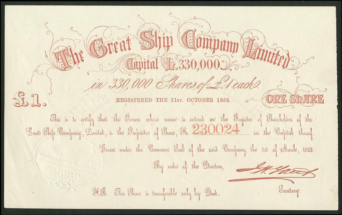 Great Britain: Great Ship Company Ltd., a group of certificates for £1 shares, all dated March 1859, 3 are printed in green and 2 in red but otherwise identical, embossed seal depicts the S.S. Great Eastern. The Great Eastern was commissioned by The Eastern Steam Navigation Company and built at John Scott Russell's yard at Millwall to the designs of Isambard Kingdom Brunel. It was then the largest ship in the world. It had a chequered history due to the bankruptcy of Scott Russell and the lack of funds with the Shipping Company. This company purchased the ship after its launch and proceeded to fit it out ready for service. Made several voyages until 1863 when losses forced the company to lay up the ship. It was sold in 1864 as a cable laying vessel and the rest of its lfe was spent as a concert hall and a floating advertising hoarding. Broken up in 1889-90. VF-EF (5).