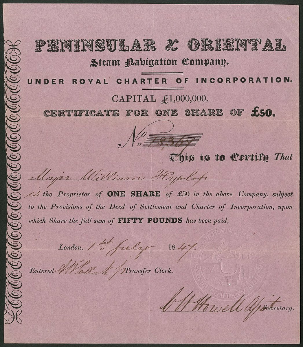Great Britain: Peninsular & Oriental Steam Navigation Company, one £50 share, London 18[47], #18367, black on mauve paper, this later type with no printers imprint, 2nd line of title 88mm long, embossed seal. Originally a partnership running regular services between England and Spain and Portugal. Won a lucrative mail contract from the Government in 1837 and incorporated by Royal Charter in 1840. The shortened P & O is now a household name. AEF and rare.