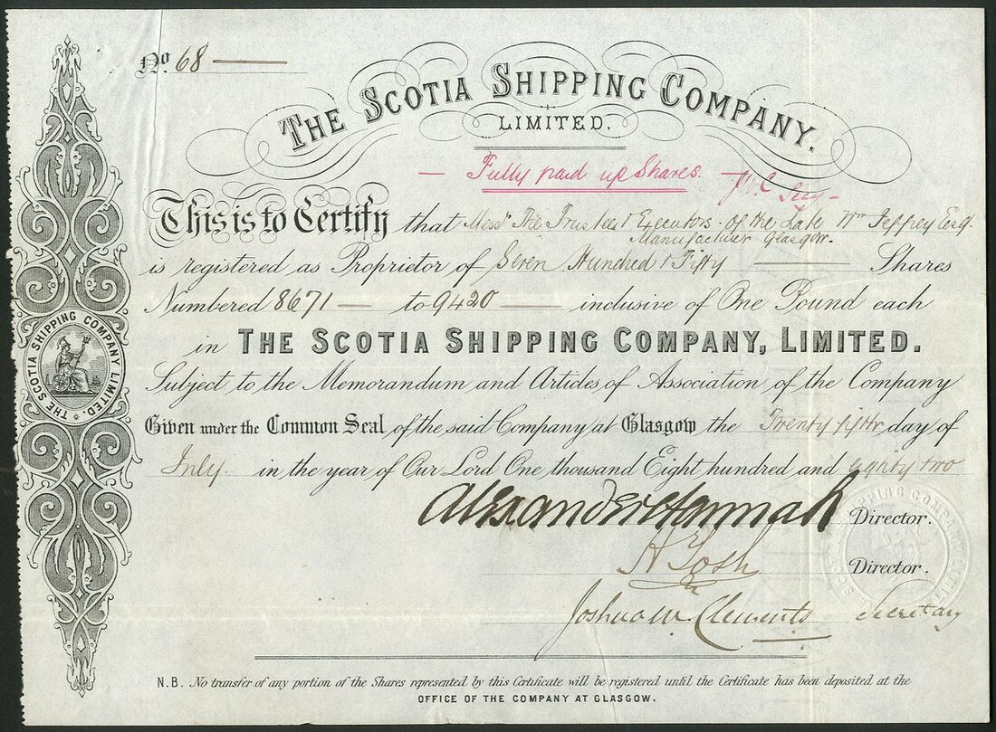 Great Britain: Scotia Shipping Co. Ltd., £1 shares, 18[82], #68, black printing with small vignette of Britannia at left, embossed seal. Based in Glasgow. VF.