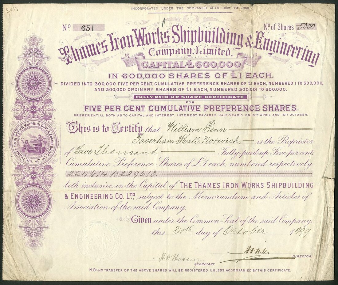 Great Britain: Thames Iron Works Shipbuilding & Engineering Co. Ltd., 5% cumulative preference shares of £1 each, [1899], #651, decorative scrollwork with vignette, mauve, printed by Waterlow & Sons. Founded in 1859, the largest shipbuilder on the Thames. It had the distinction of building the first all iron warship in 1860. In the 1880's a football club was started for its employees which by 1900 was wound up and West Ham United was created. In 1905 the motor department was developed to produce steam wagons and in 1906 a petrol car was launched. Closed in 1912. Heavily creased corners, couple of edge tears, only Fine but a rare type.