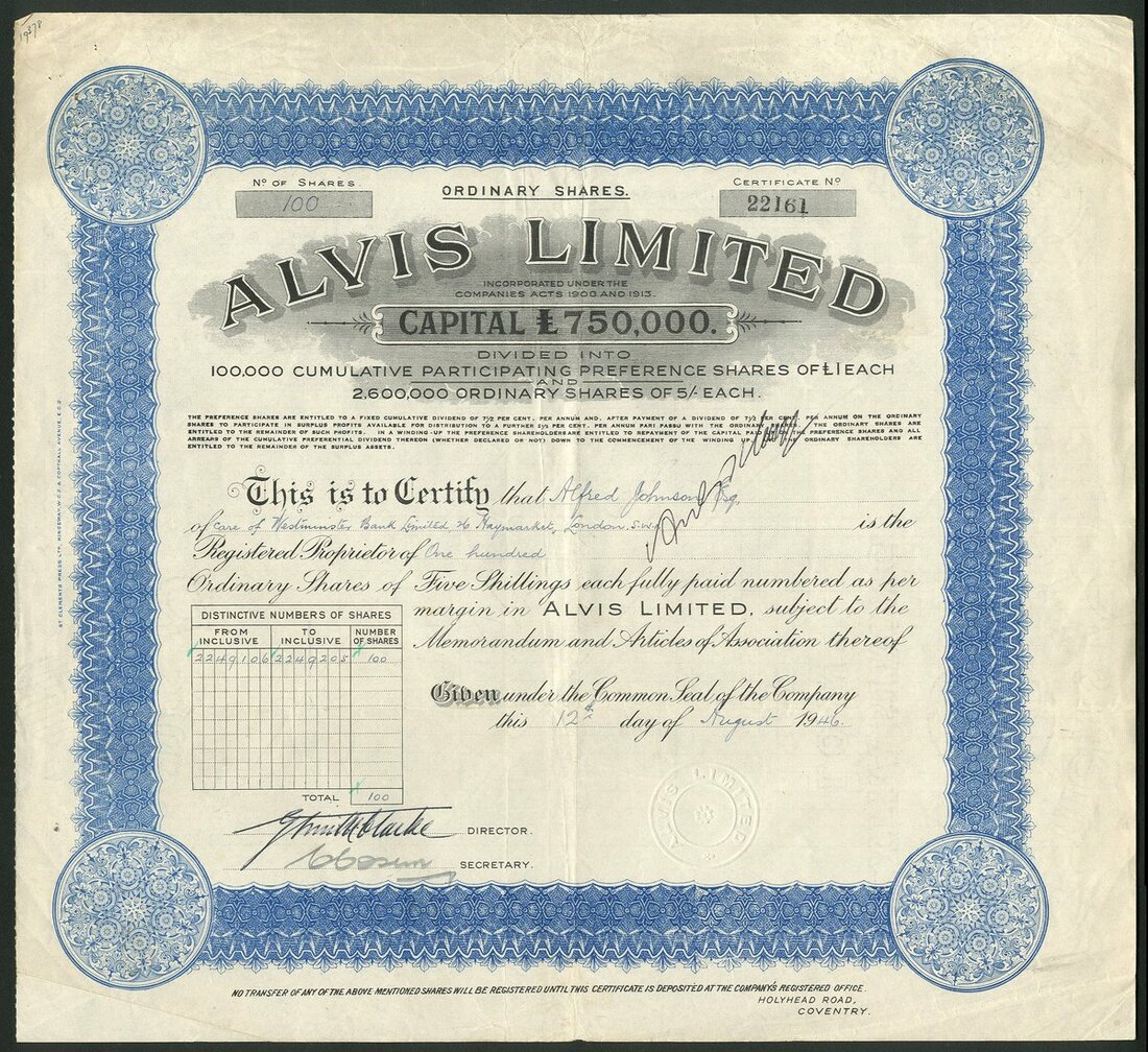 Great Britain: Alvis Ltd., ordinary 5/- shares, 19[46], #22161, ornate border, blue and black. Founded in 1919 as T.G. John and Company Ltd., making stationary engines, carburettors and motor scooters. Name changed to Alvis Car and Engineering Company Ltd. when the company built their first motor car and they soon gained a reputation for quality and innonative engineering. Name changed again to Alvis Ltd in 1936 and the company added aviation and armoured divisions at the outbreak of WWII. Rover acquired a controlling interest in 1965 but they could not improve the fortunes of the marque and production ceased by 1967. VF and only the second known example despite the high serial number.