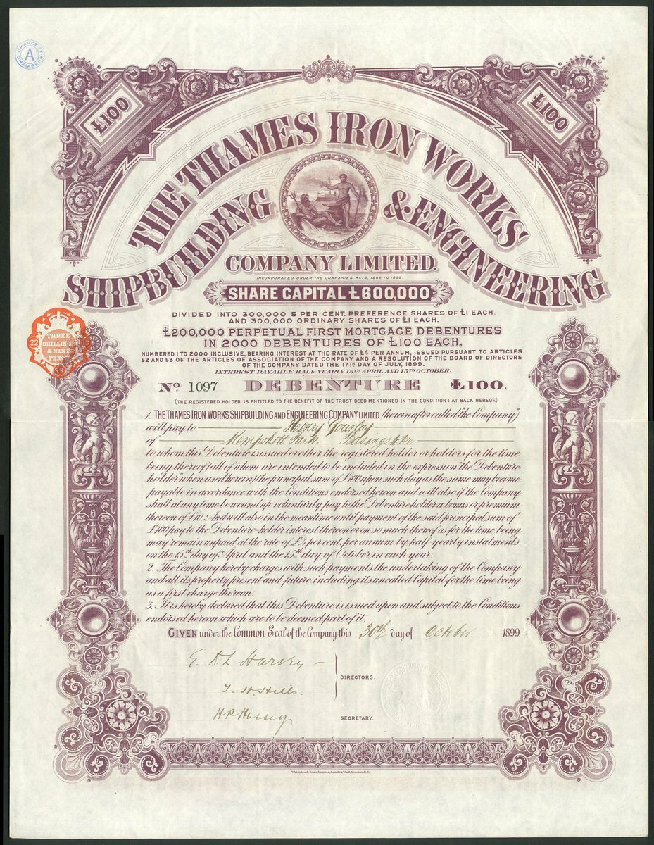 Great Britain: Thames Iron Works Shipbuilding & Engineering Co. Ltd., perpetual 1st mortgage debenture for £100, 1899, #1097, very ornate border, vignette within title of allegorical figures with ships behind, mauve, printed by Waterlow & Sons. Founded in 1859, the largest shipbuilder on the Thames. It had the distinction of building the first all iron warship in 1860. In the 1880's a football club was started for its employees which by 1900 was wound up and West Ham United was created. In 1905 the motor department was developed to produce steam wagons and in 1906 a petrol car was launched. Closed in 1912. GVF.