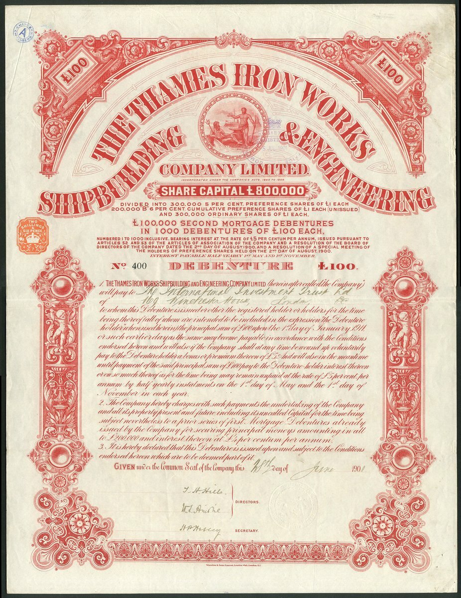 Great Britain: Thames Iron Works Shipbuilding & Engineering Co. Ltd., 2nd mortgage debenture for £100, 190[1], #400, very ornate border, vignette within title of allegorical figures with ships behind, red, printed by Waterlow & Sons. Founded in 1859, the largest shipbuilder on the Thames. It had the distinction of building the first all iron warship in 1860. In the 1880's a football club was started for its employees which by 1900 was wound up and West Ham United was created. In 1905 the motor department was developed to produce steam wagons and in 1906 a petrol car was launched. Closed in 1912. GVF.