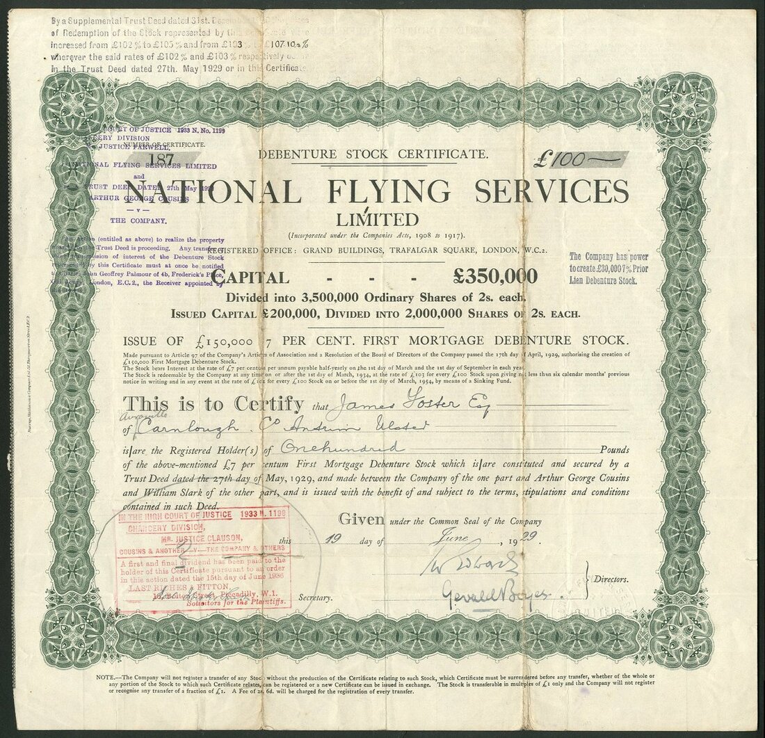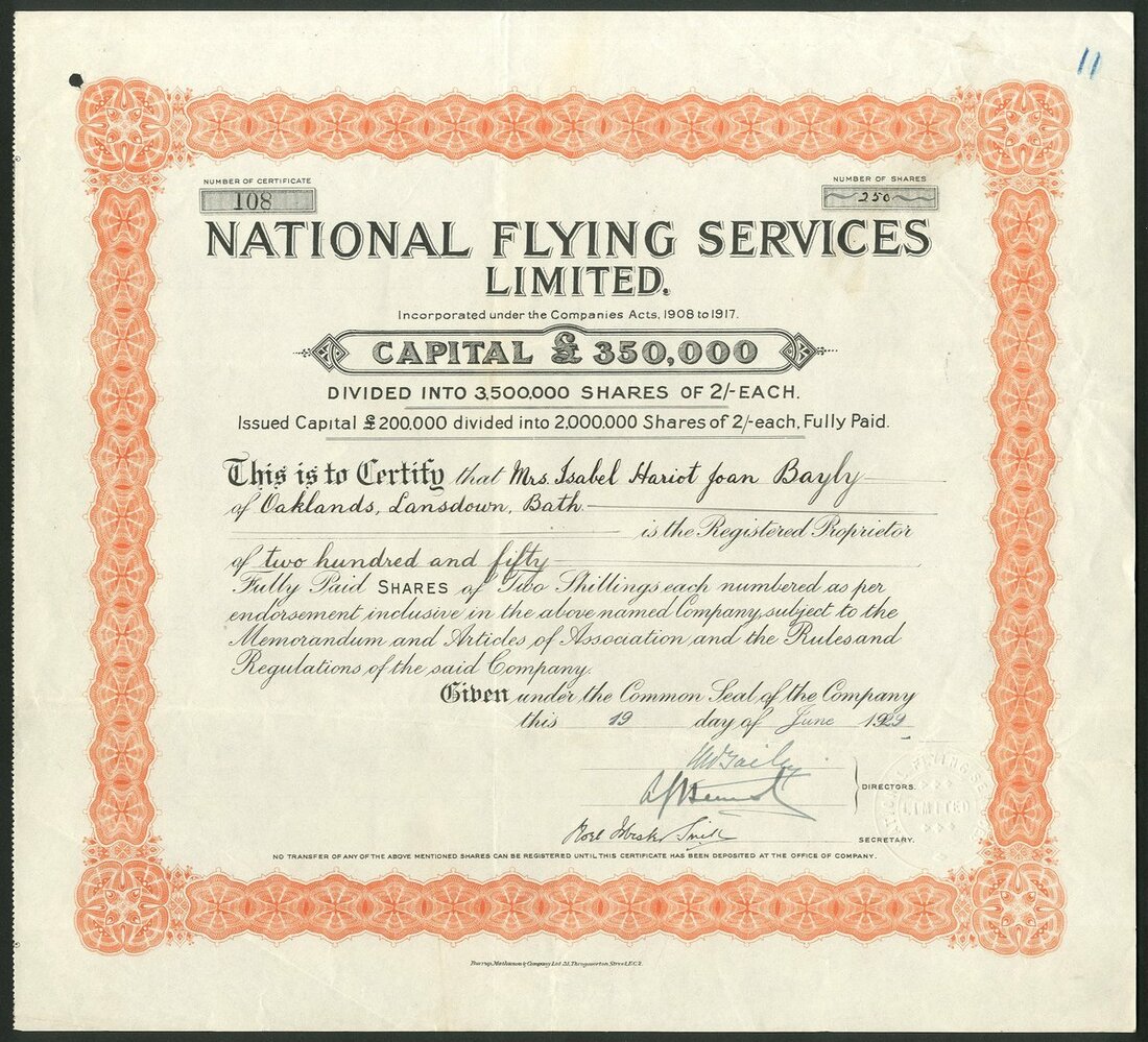 Great Britain: National Flying Services Ltd., pair of certificates for first mortgage debenture stock, 19[29], #187, and 2/- shares, also 19[29], #108, both with ornate border, green and orange respectively. Formed to build a network of airodromes, service stations and flying clubs and schools throughout Great Britain and to improve domestic air travel. The company was subsidised by the Goverment. AVF with grubby creases, second better. (2)