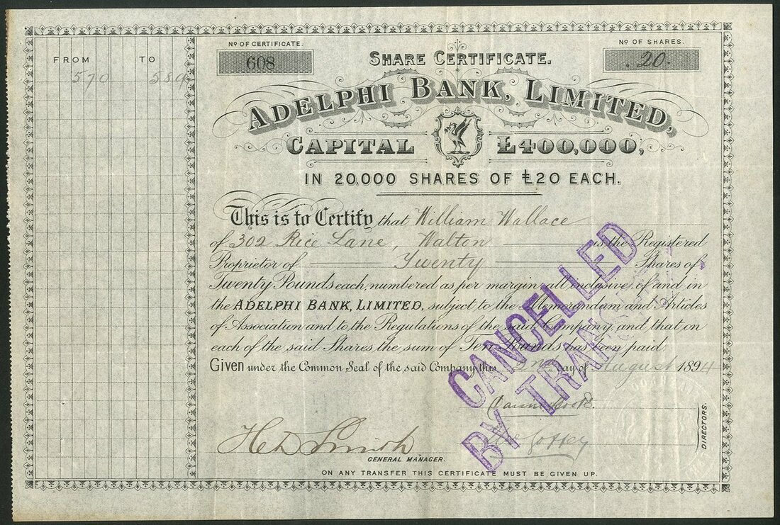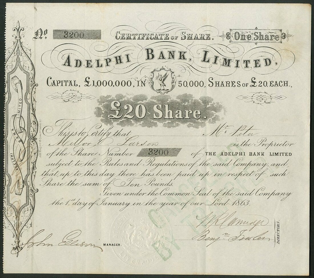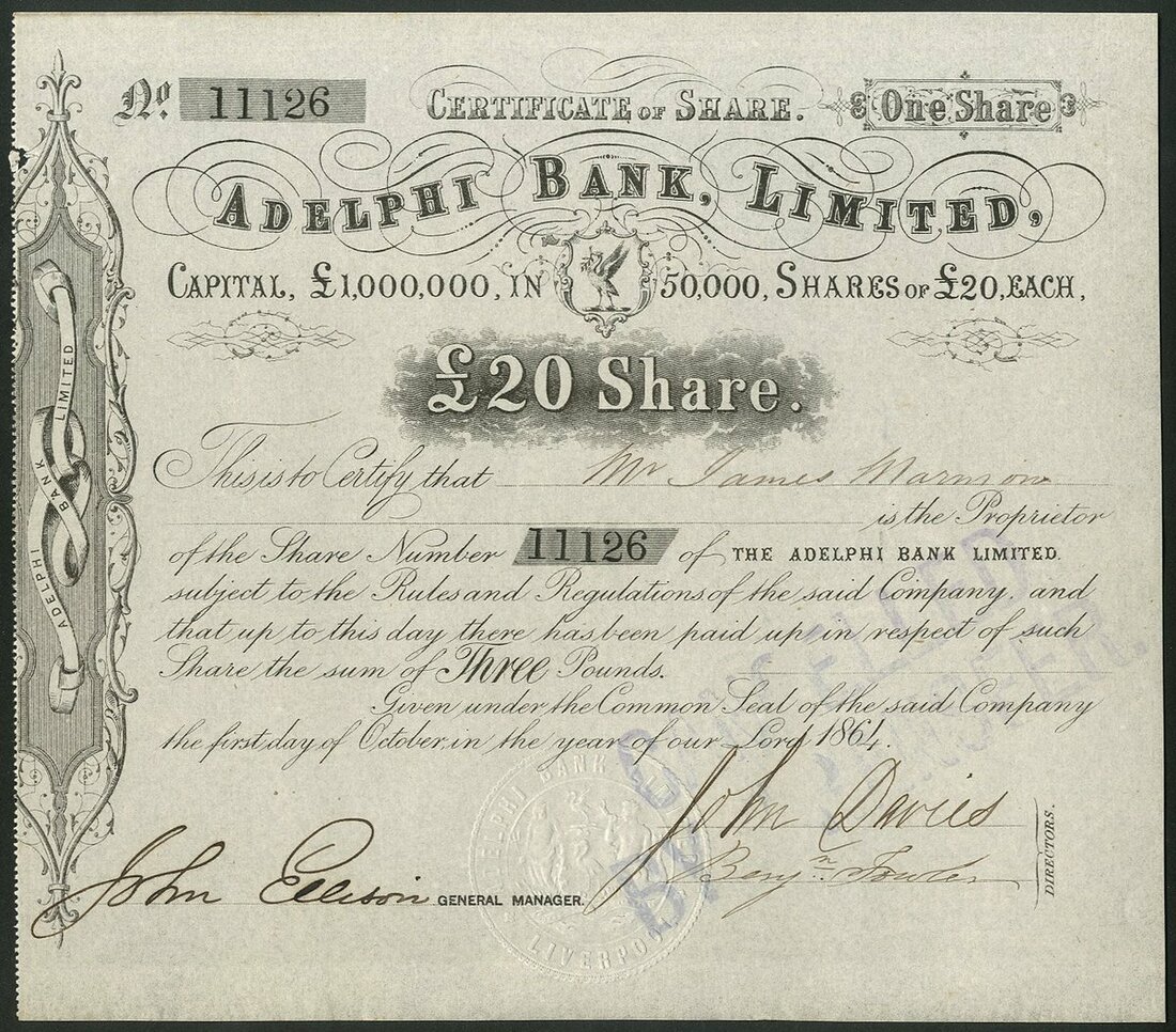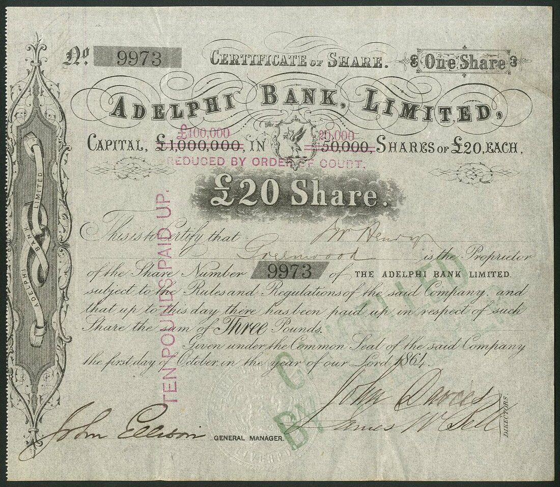Great Britain: Adelphi Bank Ltd., a small group of certificates, all different, comprising, £20 share, £10 paid, 1863, #3200; £20 share, 1864, £3 paid, #11126 and another #9973, with capital overprinted, and, 189[4], #608, £10 paid. All have small arms with Liver bird, black, stamped CANCELLED. Taken over by Lancashire & Yorkshire Bank in 1899, which is now part of Barclays Bank. VF-EF (4).