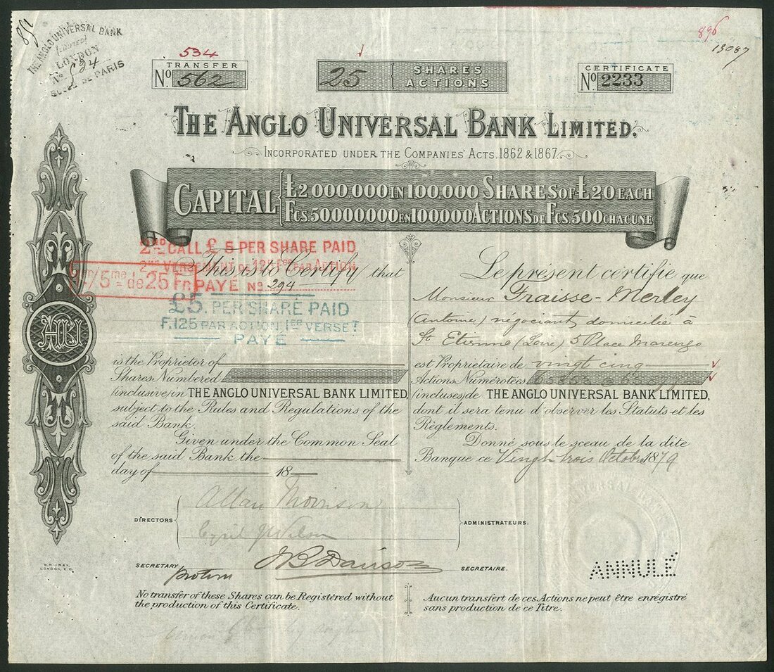 Great Britain: Anglo Universal Bank Ltd., £20 shares, 18[79], #2233, black, text in English and French, perforated 'ANNULE'. VF and rare.