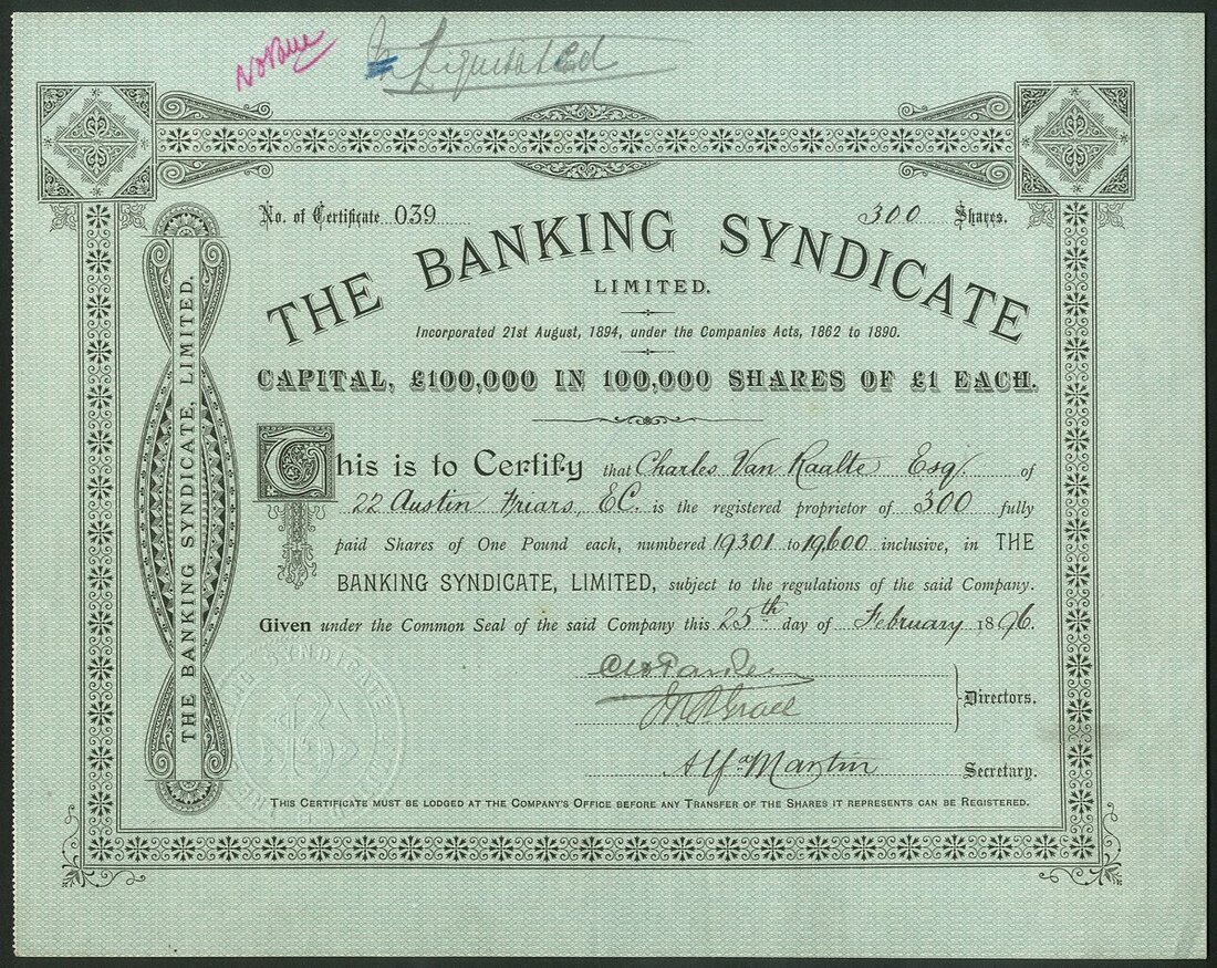 Great Britain: Banking Syndicate Limited, £1 shares, 18[96], #039, ornate border, black with blue underprint. AEF and rare. So far the only known example.