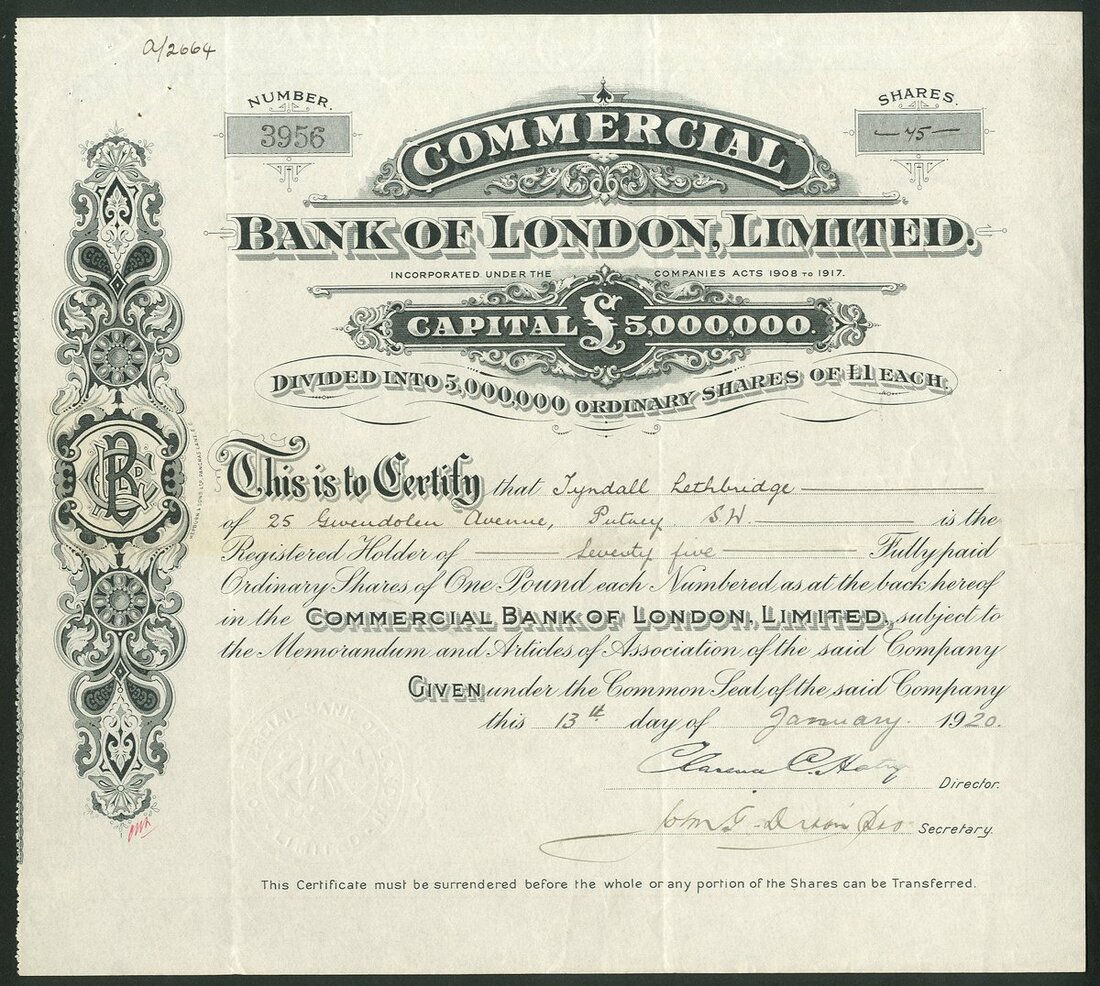 Great Britain: Commercial Bank of London Ltd., £1 shares, 19[20], #3956, facsmilie signature of Clarence Hatry as director, black printing with scrollwork. Hatry was involved in business immediately following WWI, first with the City Equitable Fire Insurance Co., and then with consolidations in several industries by creating Trusts as holding companies. He was in financial difficulty by 1928 and he falsely issued local government debentures to prop up his many ventures and borrowed large sums against them. They all finally collapsed in 1929 and the truth became evident. He was found guilty of fraud and sentenced to 14 years imprisonment. The collapse of his group of companies was thought to have contributed to the Wall Street Crash of 1929 later that year. On his release he acquired Hatchards Bookshop in Piccadily. GVF and rare..