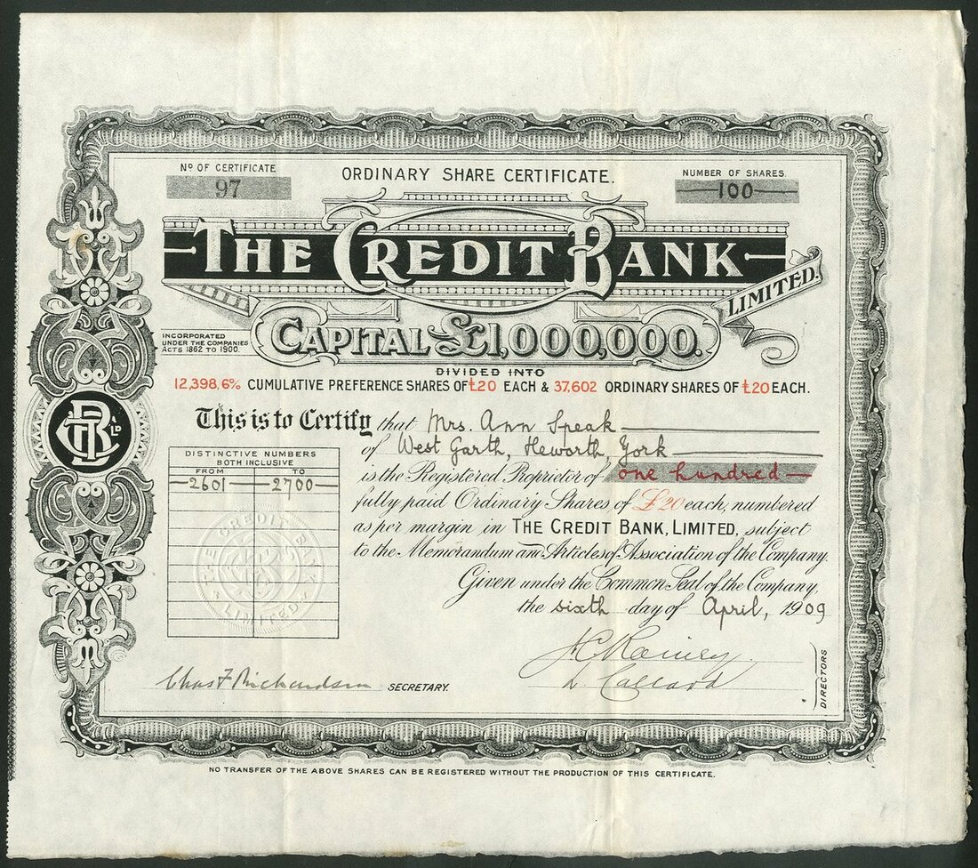 Great Britain: Credit Bank Ltd., £20 ordinary shares, 19[09], #97, very ornate border, black and red print. GVF and rare.