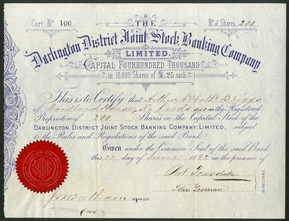 Great Britain: Darlington District Joint Stock Banking Co. Ltd., £25 shares, 18[82], #100, mauve printing with red paper seal, printed by Waterlow, Bros & Layton. Founded as the Darlington District Banking Company in 1831, later converted to Limited Liability. Acquired by the York City and County Bank in 1883 following a run on the bank caused by a fraud at their Bedale Branch. VF and rare [R10]