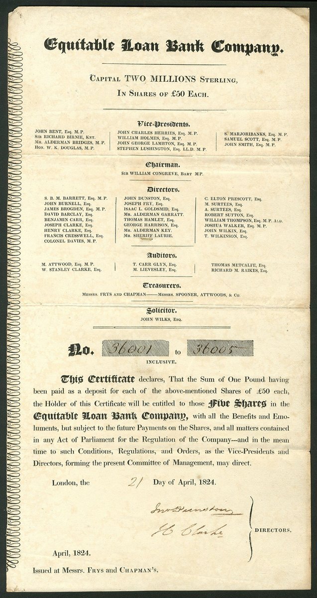 Great Britain: Equitable Loan Bank Company, 5 shares of £50, £1 per share paid, London 1824, #36001-36005, scrollwork left, black, lists all Vice presidents and directors including David Barclay, John Herries, Isaac Goldsmid and other well known banking names. The company was deemed illigal due to the implication that shares were exchangeable as they were made out to the holder. Before the repeal of the Bubble Act of 1720 all companies had to receive either a Charter or Act of Parliament to proceed. The large number of company formations in 1824 and 1825 forced Parliament's hand in 1826, probably too late for this company. VF.