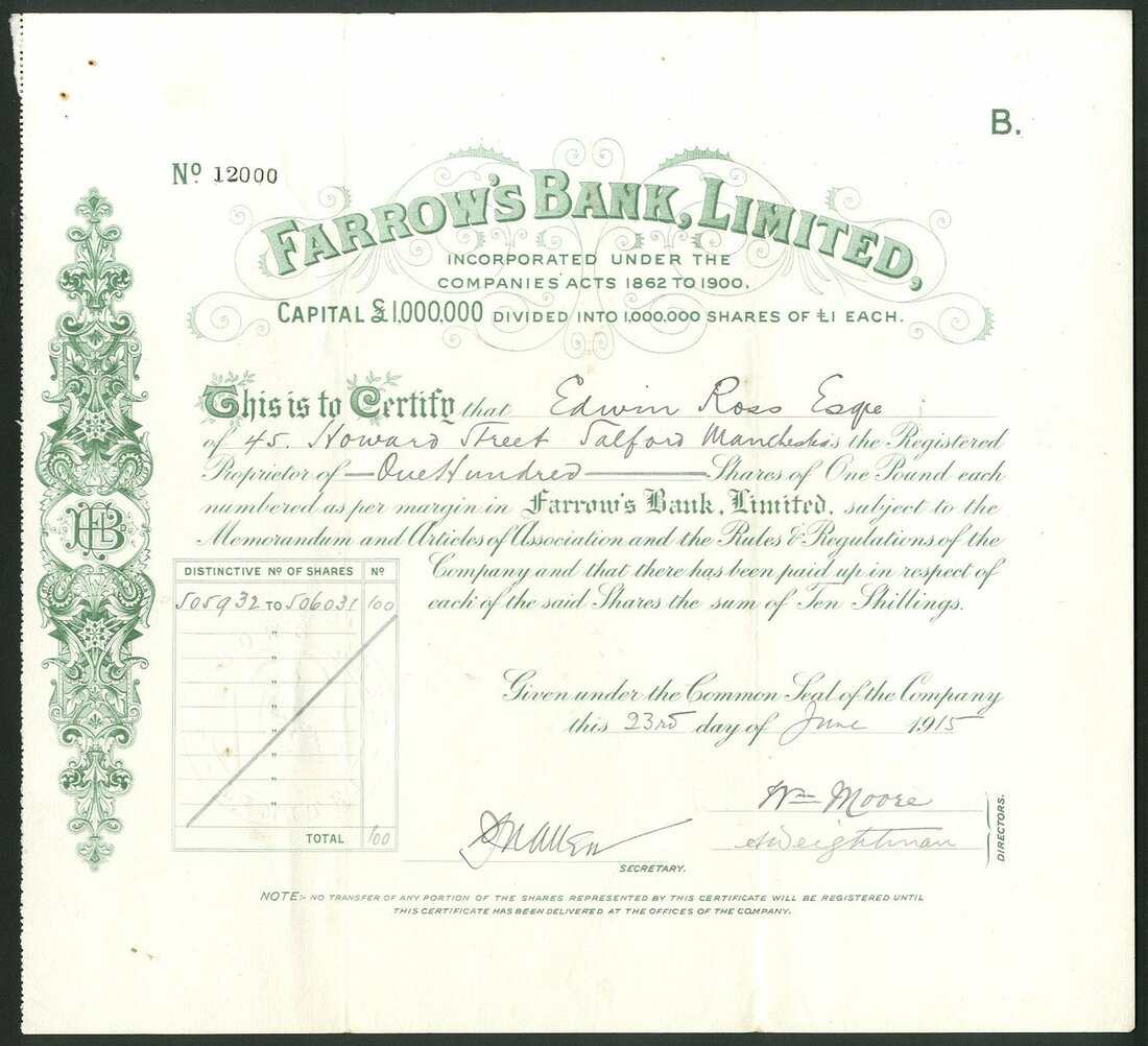 Great Britain: Farrow's Bank Ltd., pair of certificates for £1 shares, 19[11], #5961, capital £500,000, and 19[15], #12000, capital £1,000,000, both green with scrollwork. VF. (2)