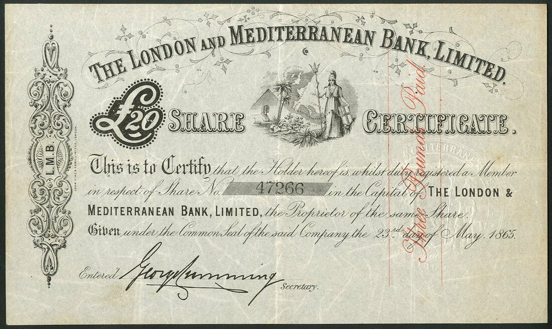Great Britain: London and Mediterranean Bank Ltd., £20 share, 1865, #47266, small vignette with Britannia in centre, black. Originally registered as the Continental Bank Corporation but name changed to this when it merged with the Alexandria private bank of E. Landau and Co.Merged with the London and Bombay Bank to become the London, Bombay and Mediterranean bank. In liquidation by 1867. VF and the only example known to us.