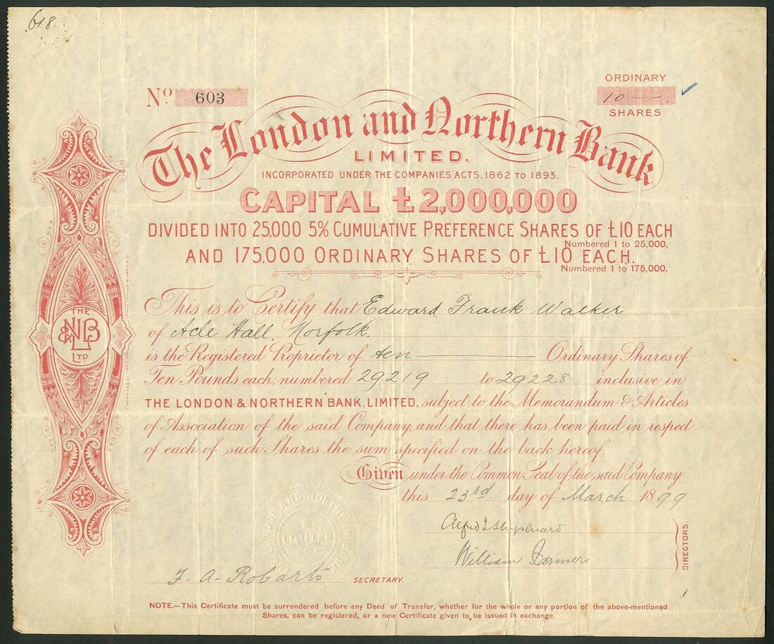 Great Britain: London and Northern Bank Limited, £10 ordinary shares, 18[99], #603, scrollwork at left, red. Established in 1898 out of the remains of the Leeds Joint Stock Bank Ltd. Failed in 1899 and most of the business acquired by Bradford District Bank. Creased, F-VF and scarce.