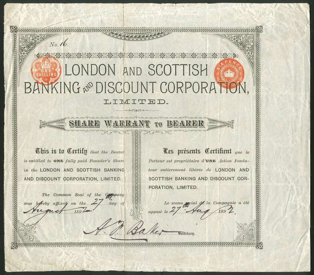 Great Britain: London and Scottish Banking and Discount Corporation Ltd., bearer warrant for one founders share, 189[2], #16, text in English and French, decorative border, black. Heavy creasing, AVF.