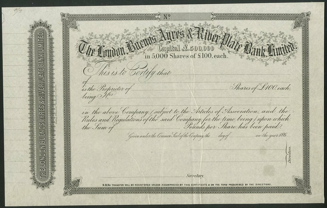 Great Britain: London, Buenos Ayres & River Plate Bank Ltd., specimen certificate from the Bradbury Wilkinson archives, £100 shares, 186-, black with ornate border and decorative title. Incorporated in 1862. Changed its name in 1865 to London & River Plate Bank. Acquired by Lloyds Bank in 1918 who promptly merged it with London and Brazilian Bank and renamed Bank of London and South America (BOLSA). A few creases, AEF.