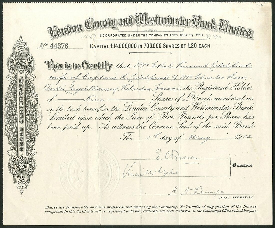 Great Britain: London County and Westminster Bank Ltd., £20 shares, 19[12], #44376, black with scrollwork. A combination of the London and County Bank and the London and Westminster Bank. Acquired Parr's Bank to become London, County, Westminster & Parr's Bank Limited and a few years later shortened to Westminster Bank Limited. VF and rare type.