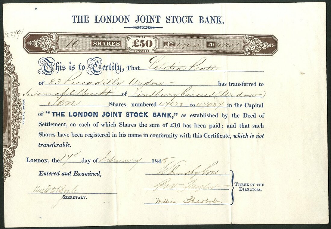 Great Britain: London Joint Stock Bank, £50 shares, 184[5], #47028-47037, blue and brown. The London Joint Stock Bank was organised in 1836 and absorbed into the Midland Bank under the title of London Joint City and Midland Bank in 1918 to become the largest bank in the world. Name changed to Midland Bank Limited and more recently acquired by HSBC. Tiny edge tear at bottom, VF.