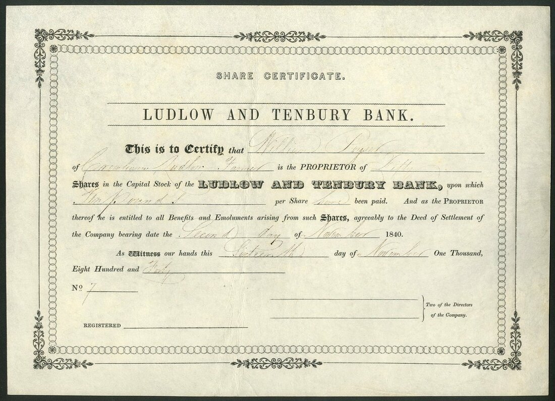 Great Britain: Ludlow and Tenbury Bank, capital stock, 1840, #7, decorative border, black, on vellum. All details completed but no directors signatures. Founded in 1840. Amalgamated with Worcester City & County Banking Co. Ltd. in 1864. GVF and very rare.