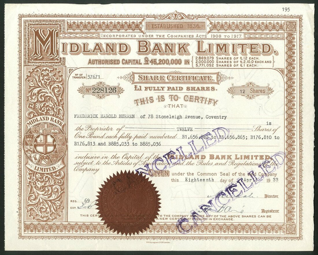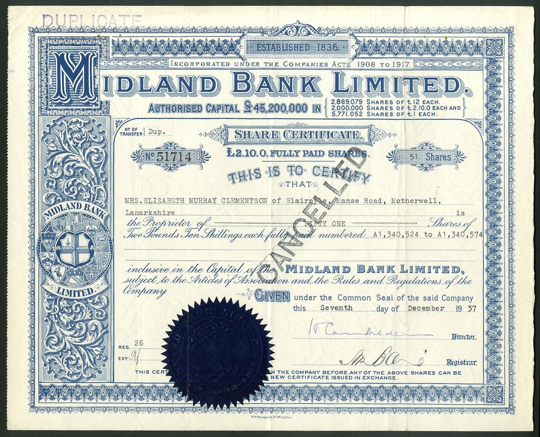 Great Britain: Midland Bank Ltd., pair of certificates; £2.10.0 shares, 19[37], #51714, blue, cancelled, and £1 shares, 19[33], #228126, brown, also cancelled, both of the same ornate design with company seal at left. Now HSBC. VF. (2)