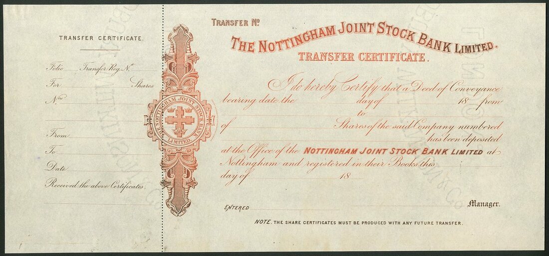 Great Britain: Nottingham Joint Stock Bank Ltd., specimen transfer certificate from the Bradbury Wilkinson archives, 18--, circa 1865, red. Established in 1865. Amalgamated with London, City & Midland Bank Limited in November 1905. EF.