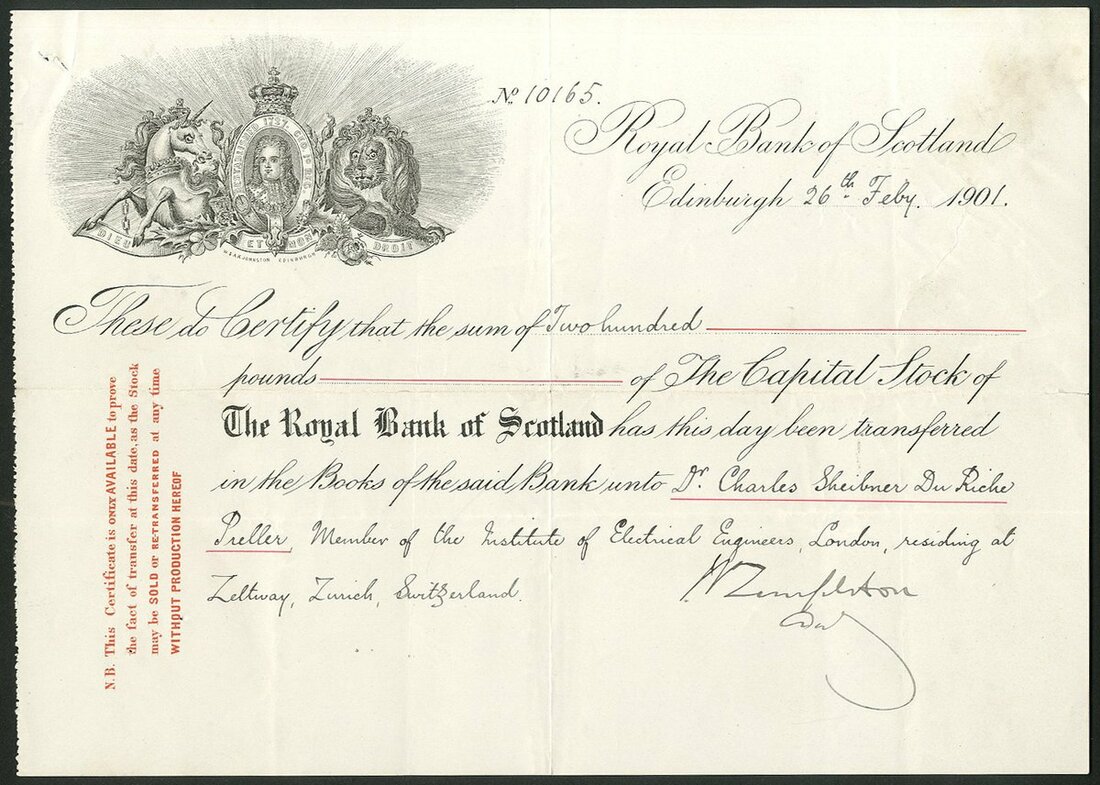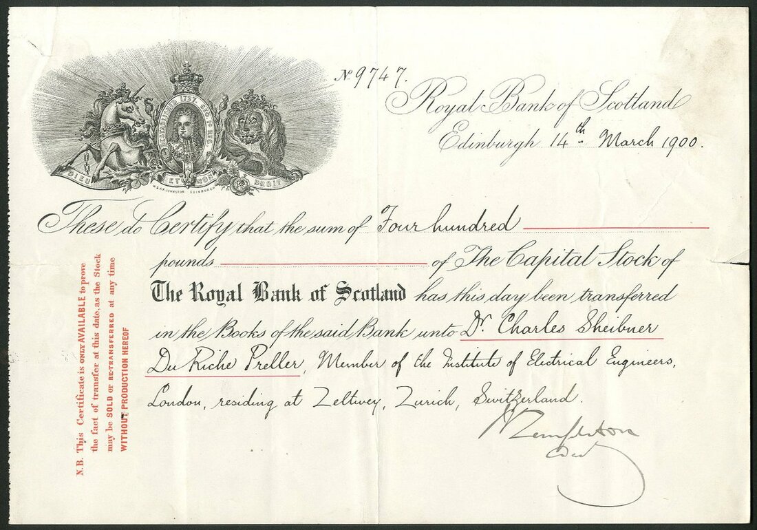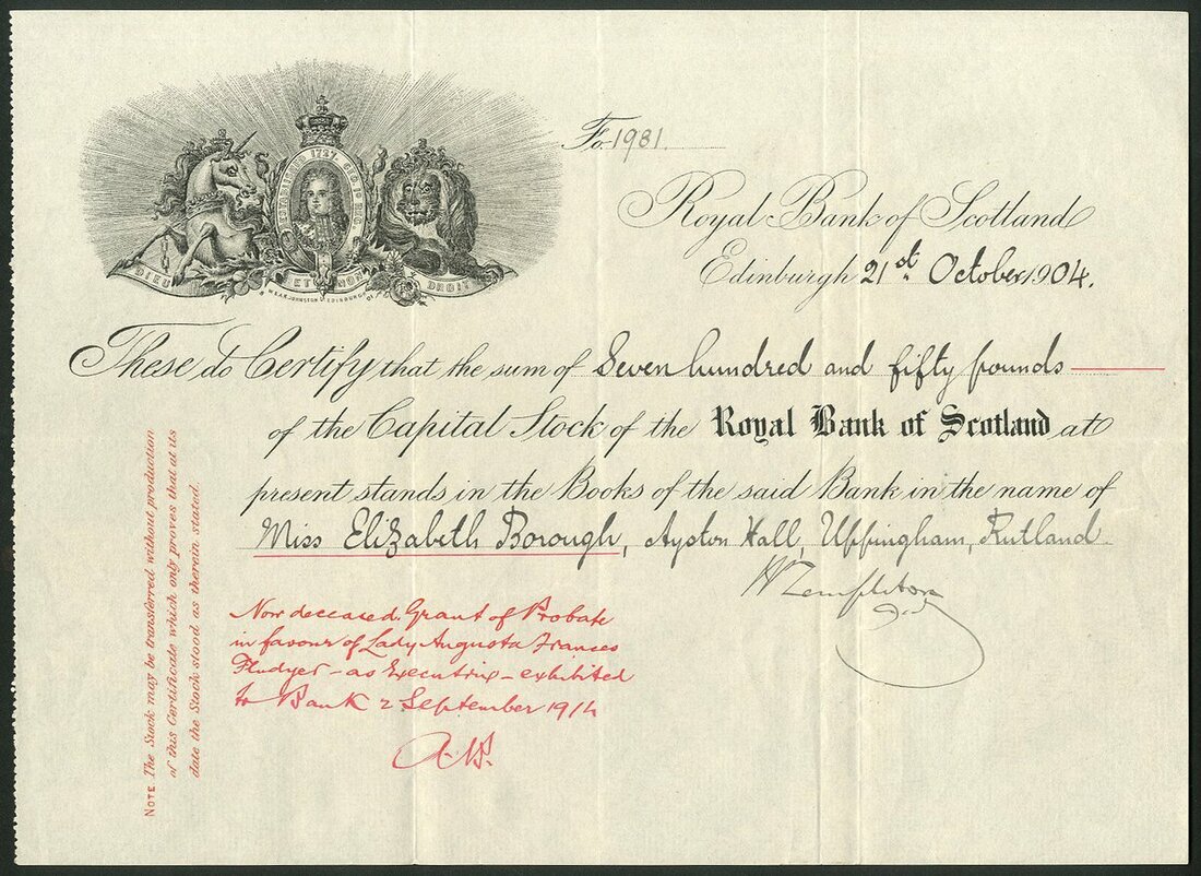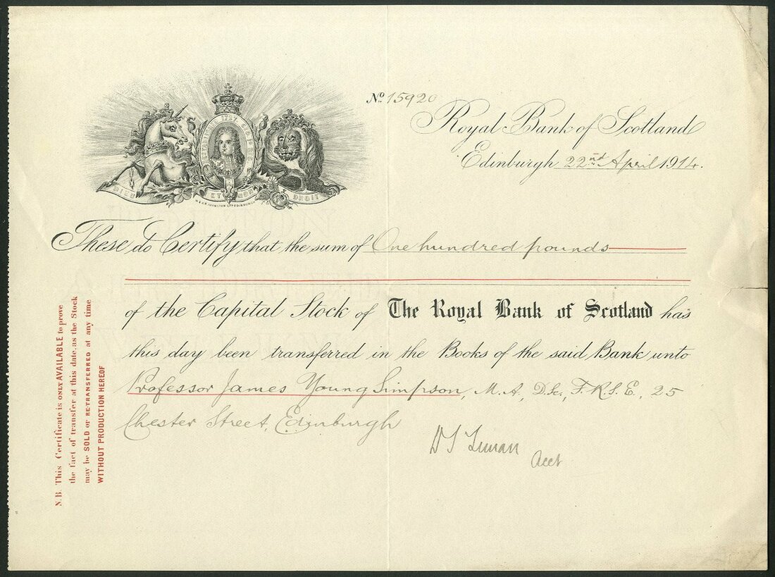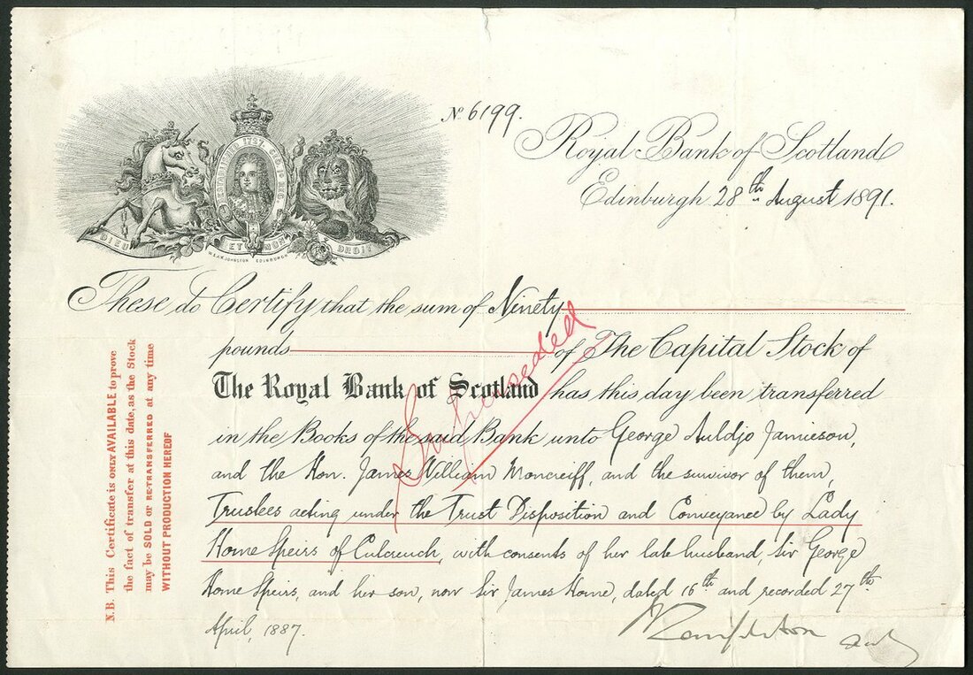 Great Britain: Royal Bank of Scotland, group of 5 certificates for capital stock, varying amounts, 18[91], #6199, [1900], #9747, 190[1], #10165, 19[04], #1981, and 19[14], #15920, all with printed seal top left, all different printing varieties. A few edge tears, some minor marks, generally VF. (5)