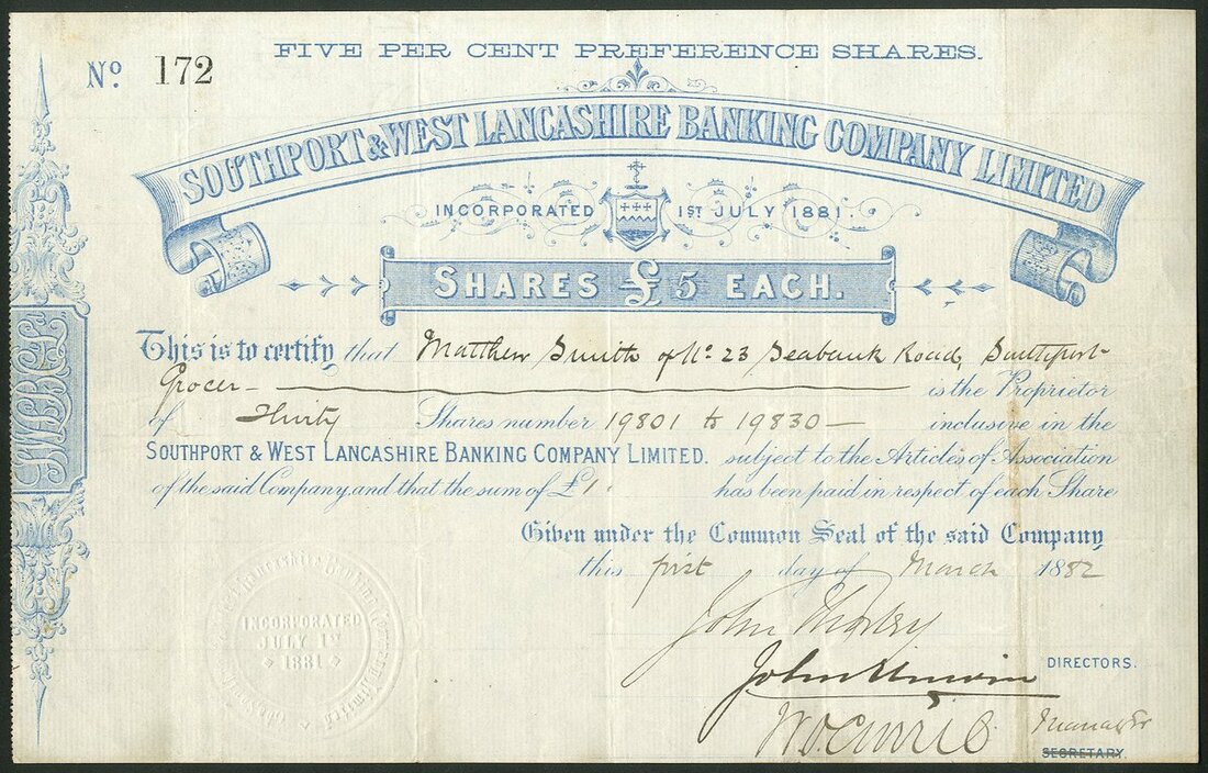 Great Britain: Southport & West Lancashire Banking Co. Ltd., 5% preference shares of £5 each, 18[82], #172, blue printing. Incorporated in 1881. Acquired by the Manchester & Liverpool District Banking Company in 1884. VF and rare. The only known example known to us.